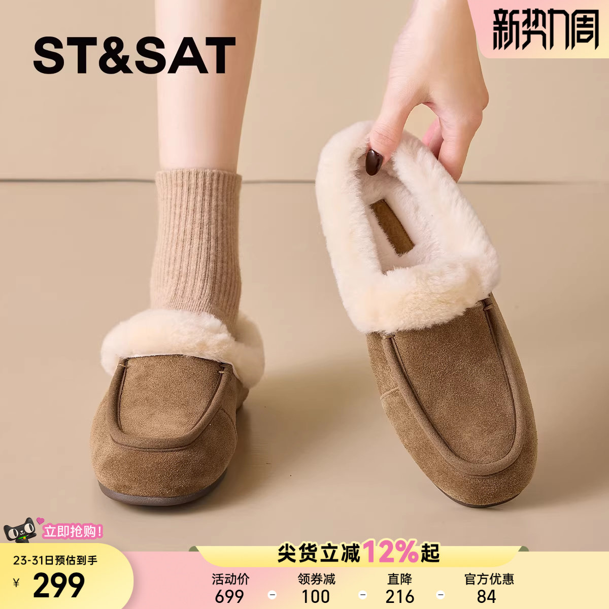 星期六毛毛鞋女款春季加绒保暖新款乐福女鞋平底棉鞋豆豆鞋子