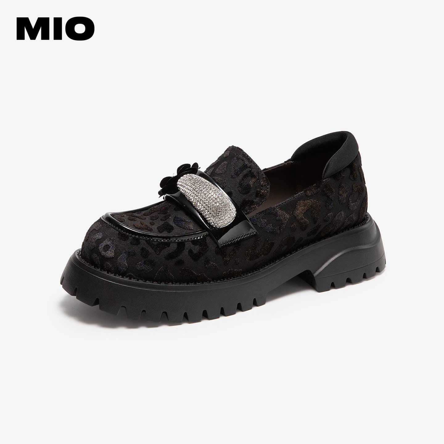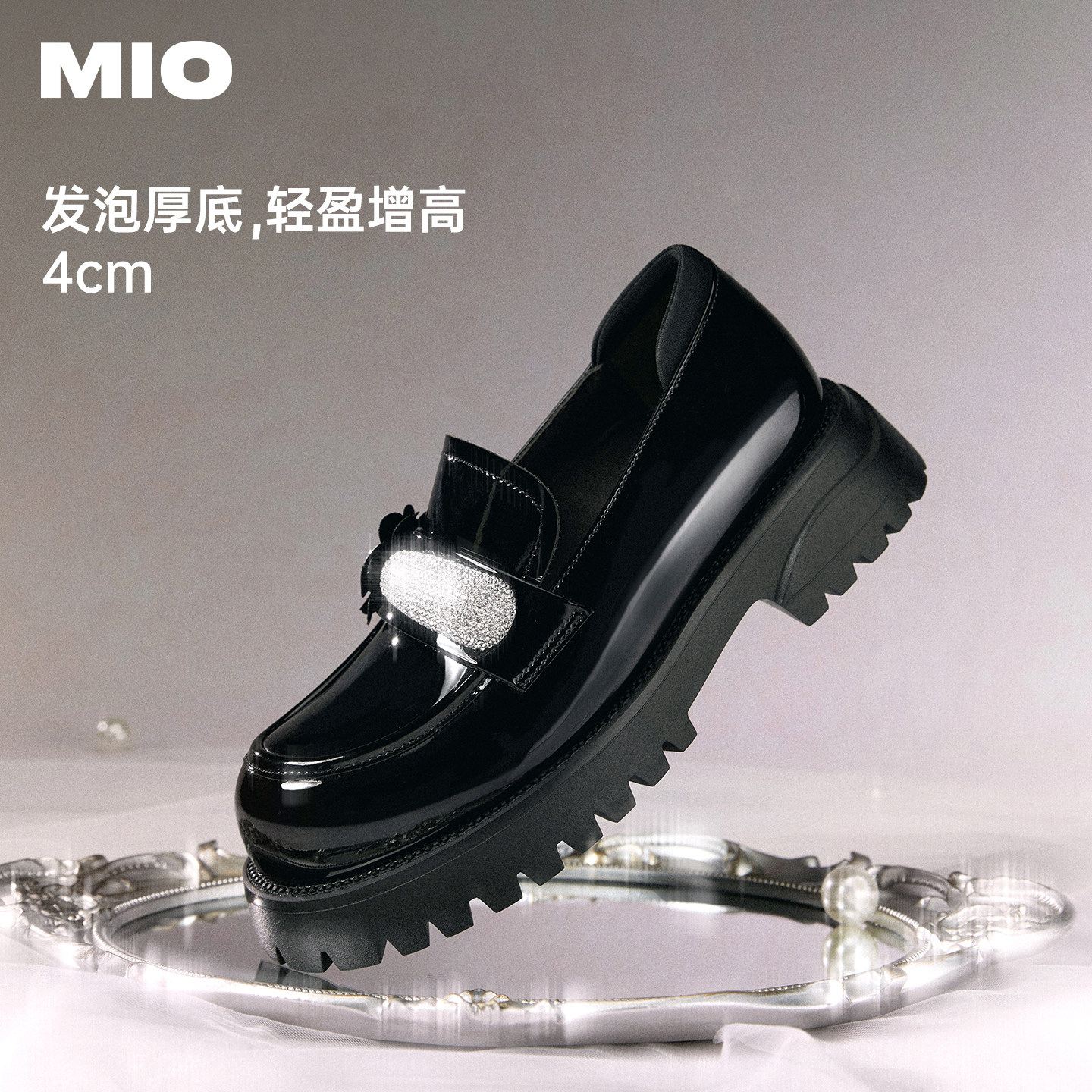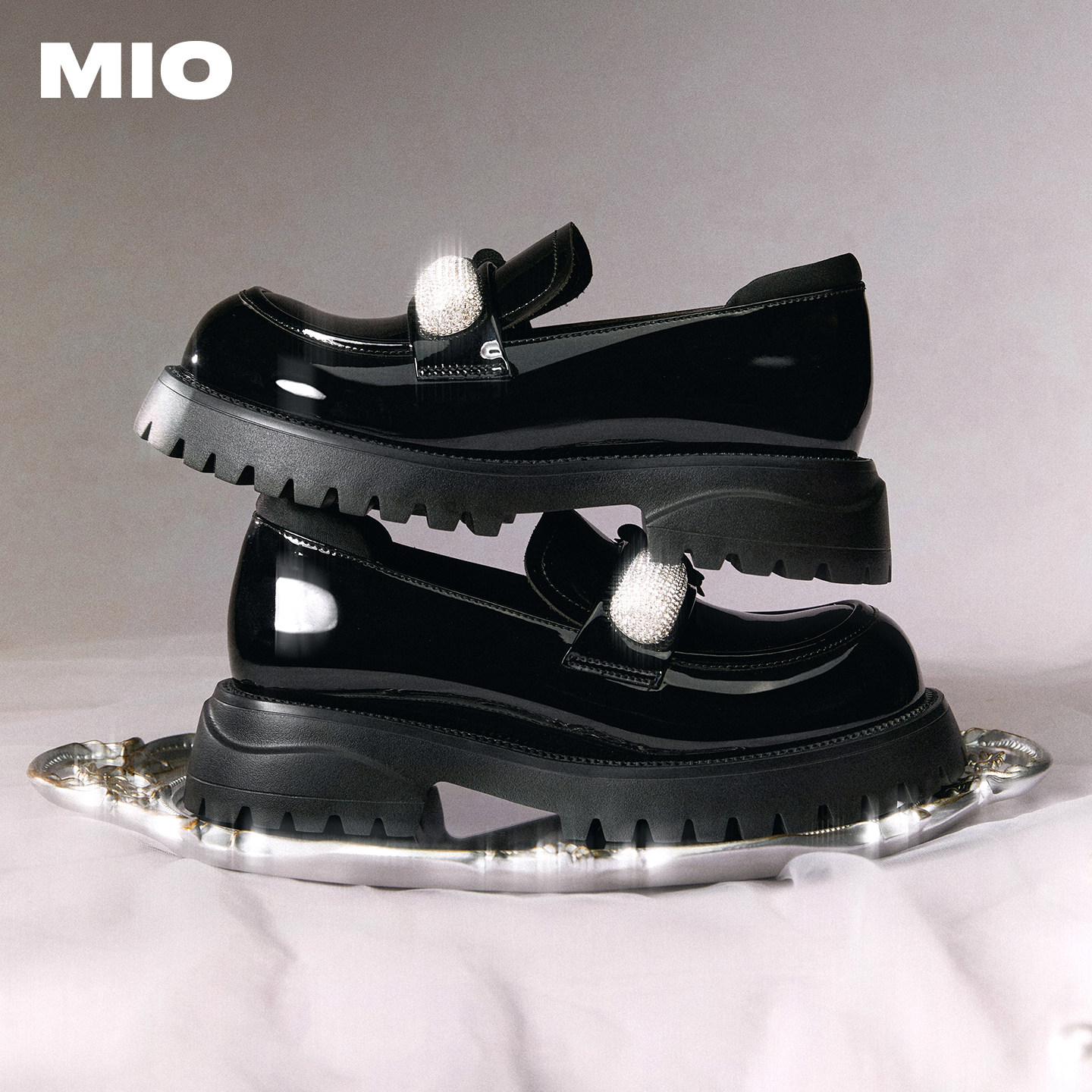 MIO米奥乐福鞋钻饰花朵春季圆头粗跟学院厚底黑色亮面小皮鞋女