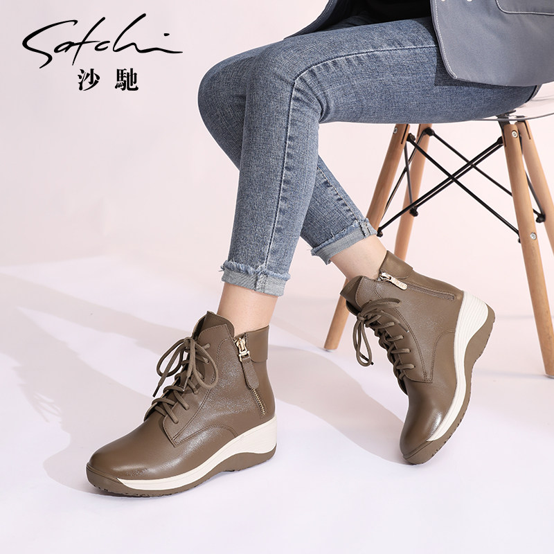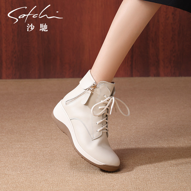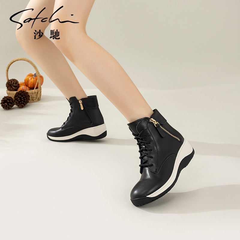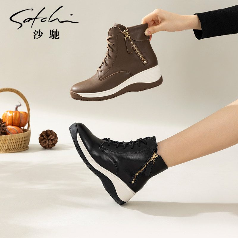 沙驰女鞋牛皮坡跟休闲短靴2025冬季新款时尚内增高短筒马丁靴女靴