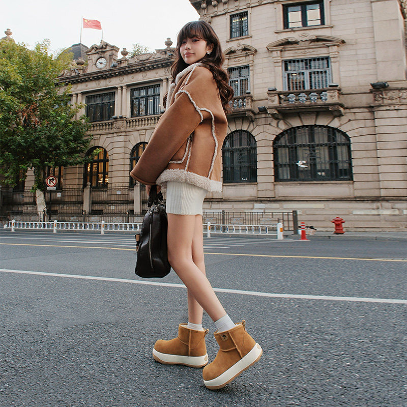 miu家厚底雪地靴女冬季真皮短靴羊毛侧拉链增高厚底加绒毛毛棉鞋