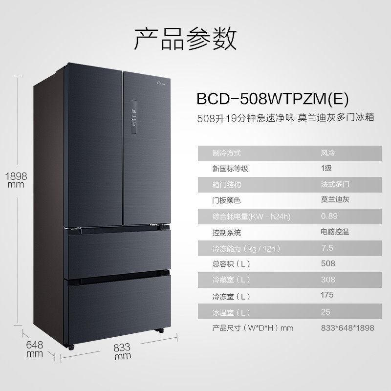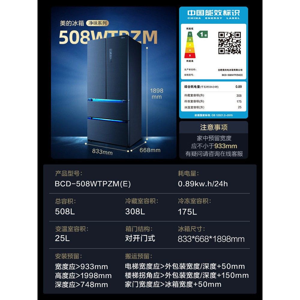 美的 BCD-508WTPZM(E) 法式多门双系统一级变频风冷无霜家用冰箱