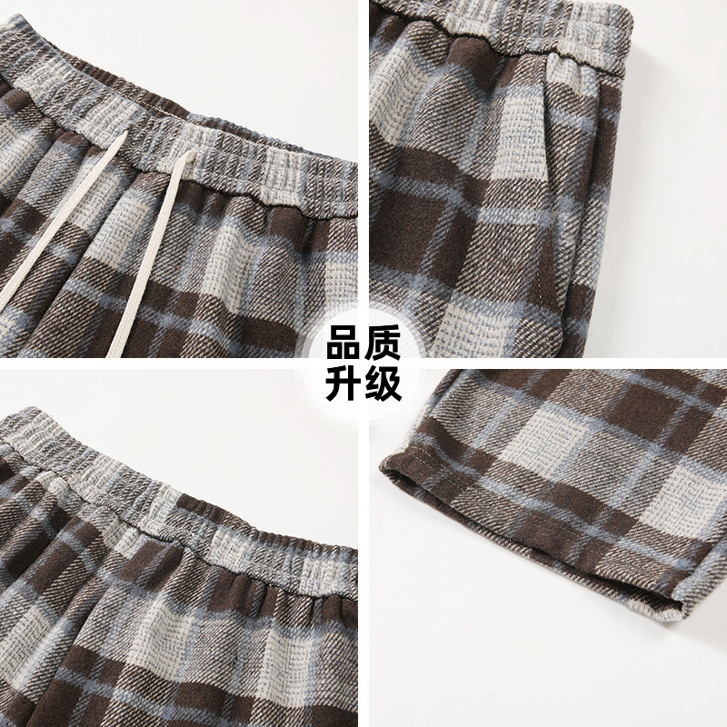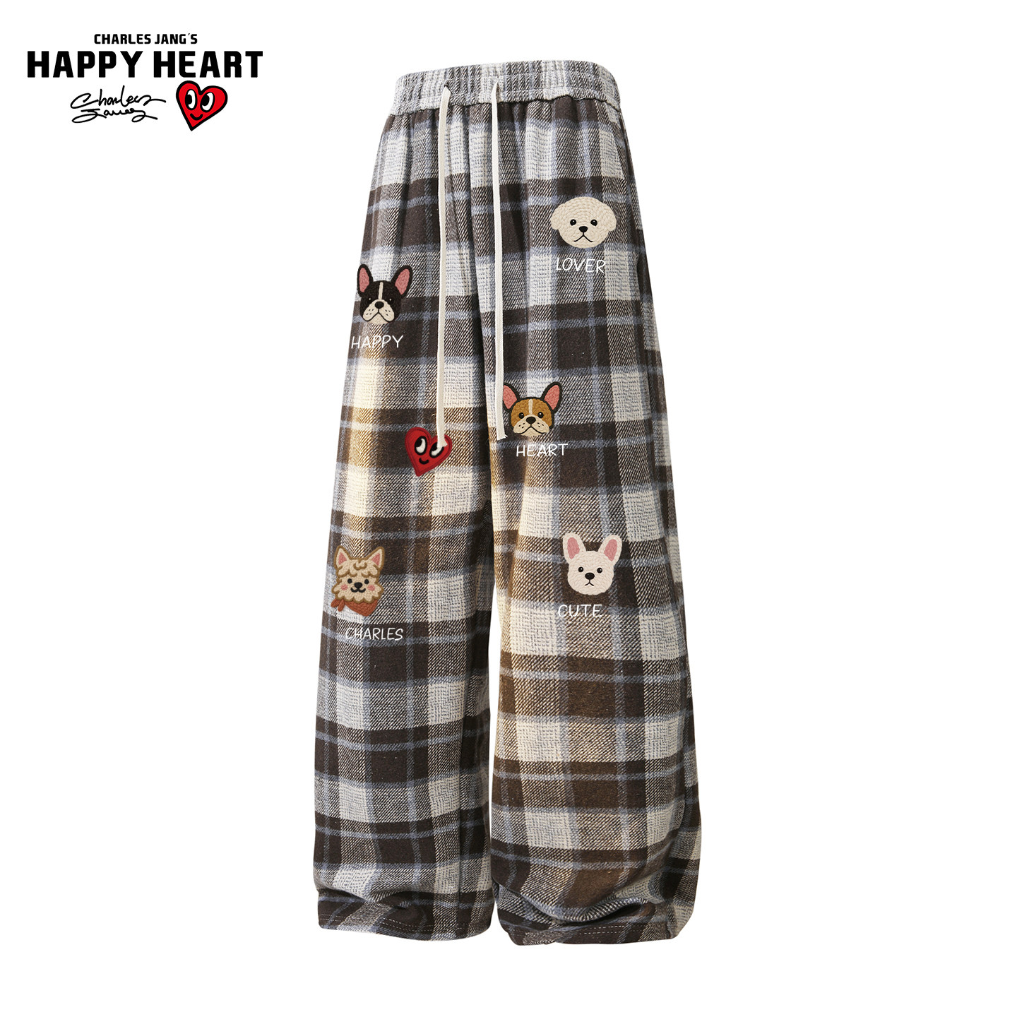 查尔斯桃心美式小香风休闲裤男春秋季小狗印花拼色格纹阔腿长裤子