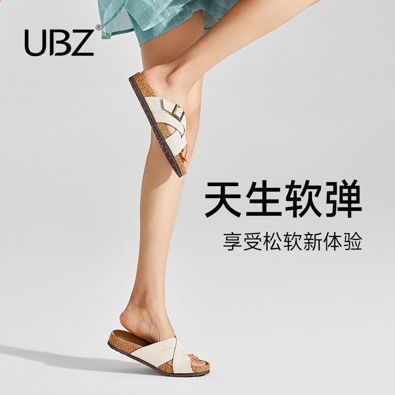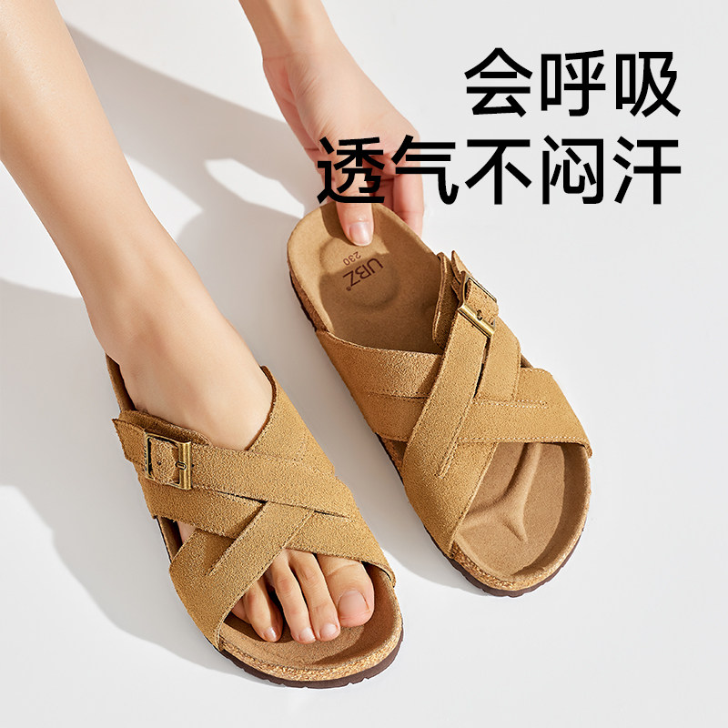 UBZ 勃肯拖鞋女夏外穿2026年新款时尚软木平底真皮配裙子沙滩凉鞋