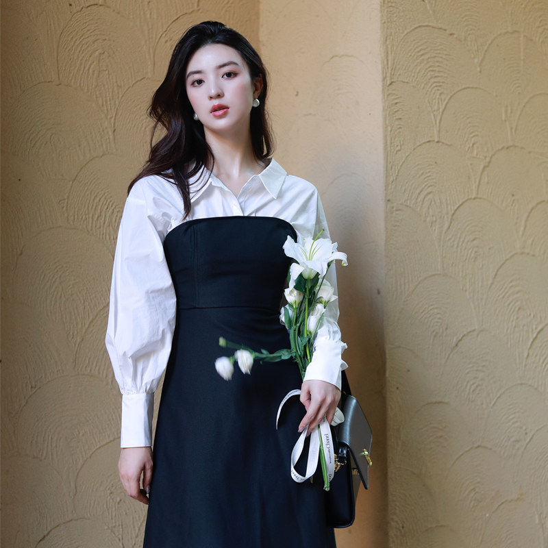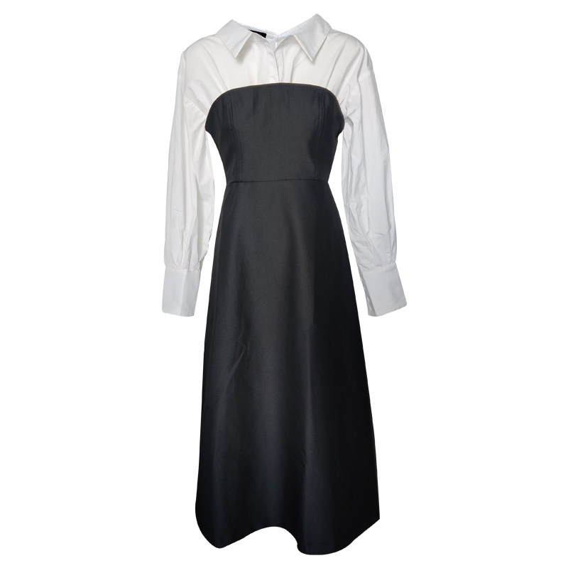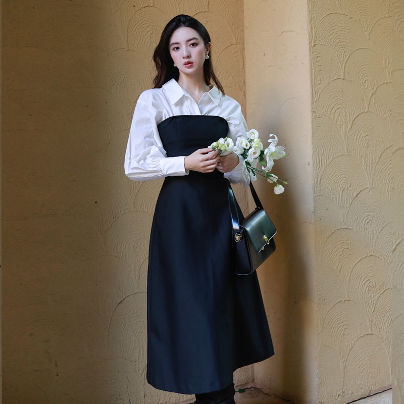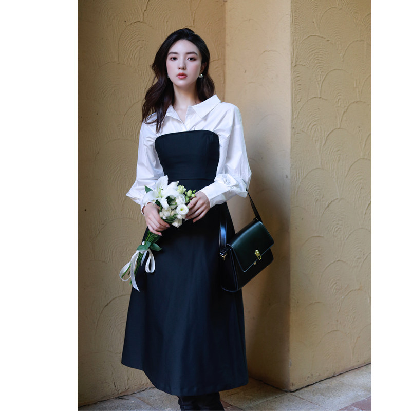 赫本风黑色裙子朴妍珍明星同款假两件拼接衬衫连衣裙高级感长裙女
