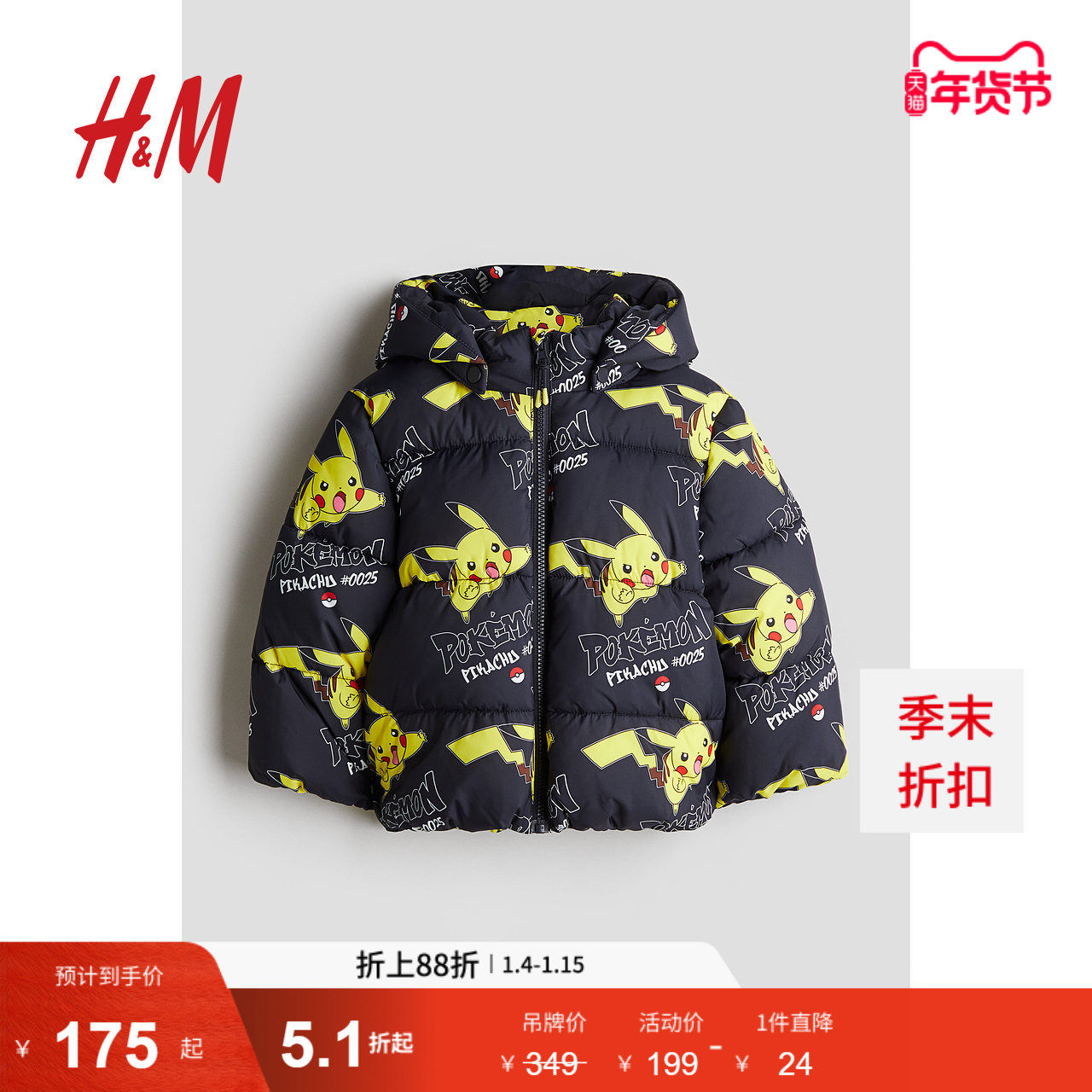 【宝可梦系列】HM童装男童棉服冬季皮卡丘保暖疏水外套1242009