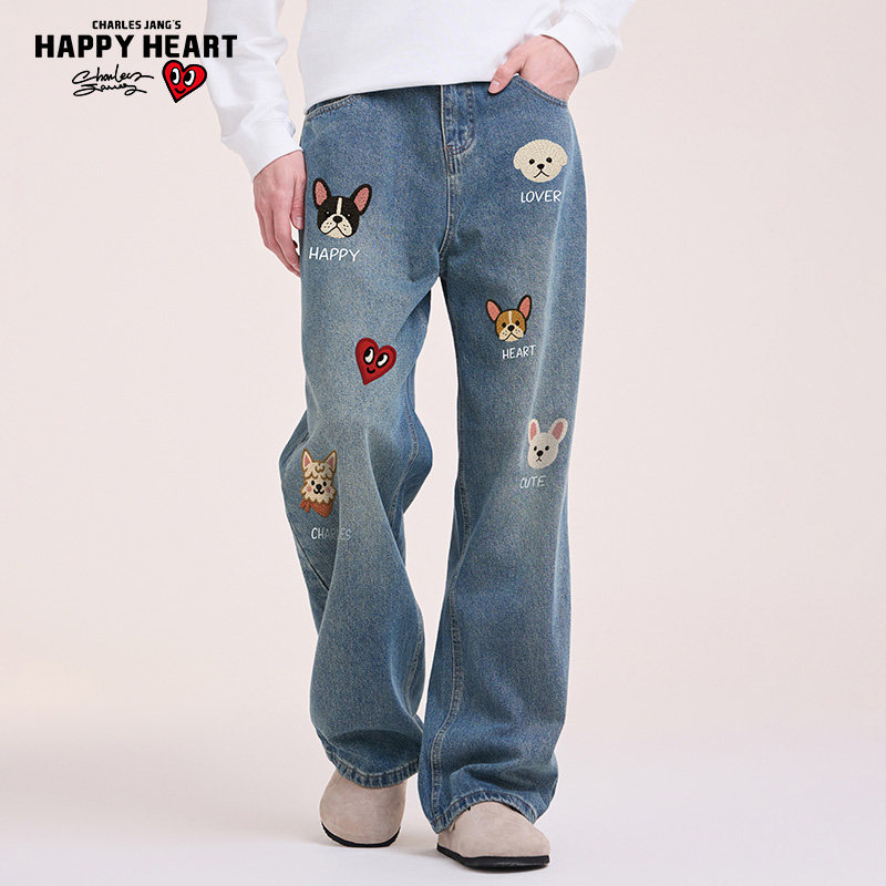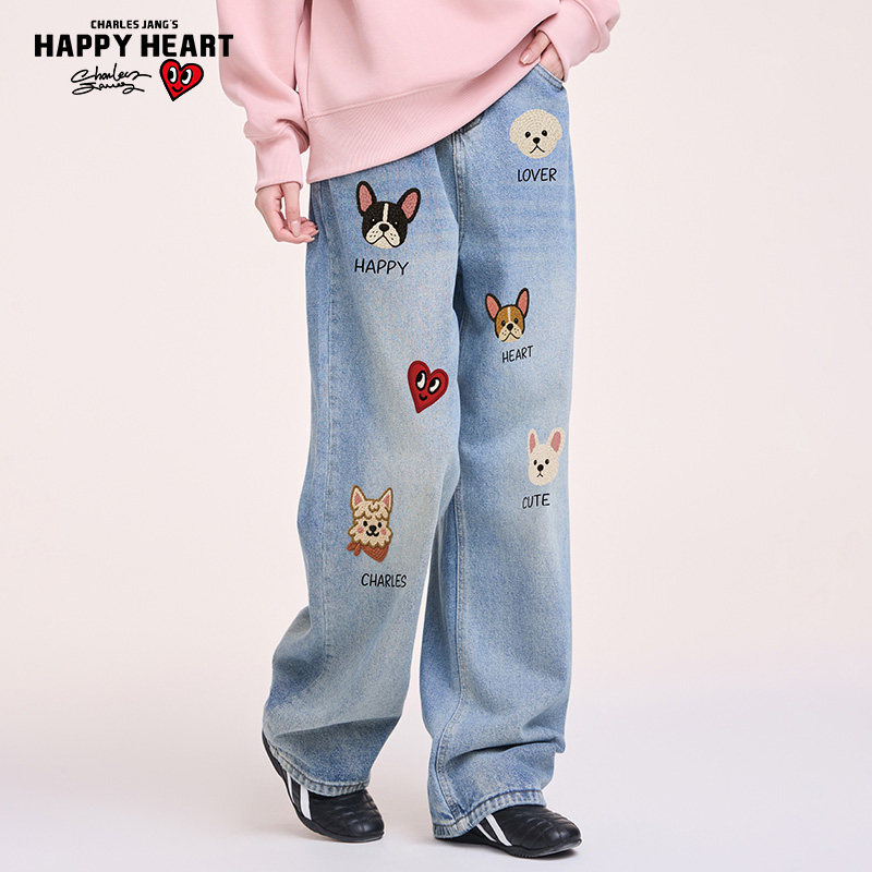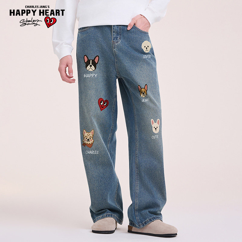 查尔斯桃心 小狗印花牛仔裤男女水洗直筒复古休闲宽松潮牌裤子
