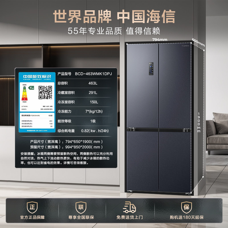 海信463L十字双开四门官方一级无霜家用风冷嵌入式超薄节能冰箱