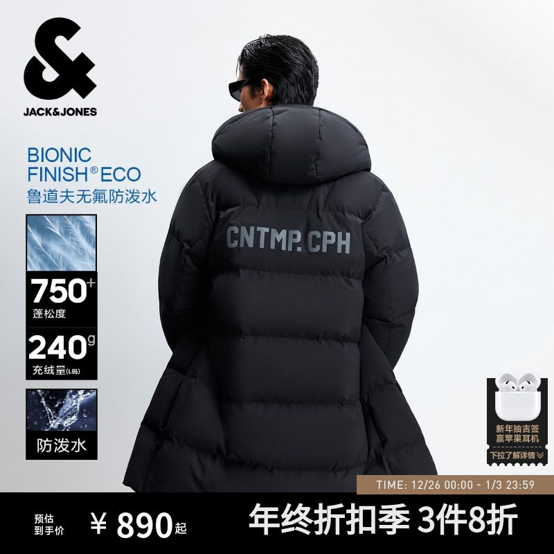 【防泼水机能冰壳】杰克琼斯男装羽绒服男冬季中长款外套连帽大衣