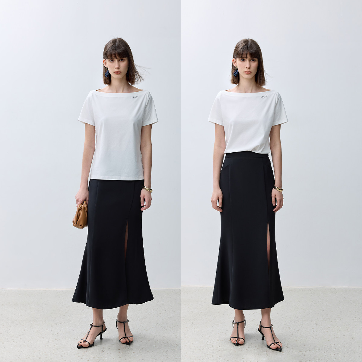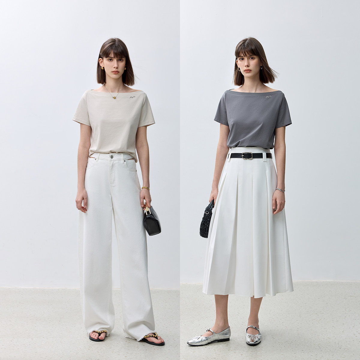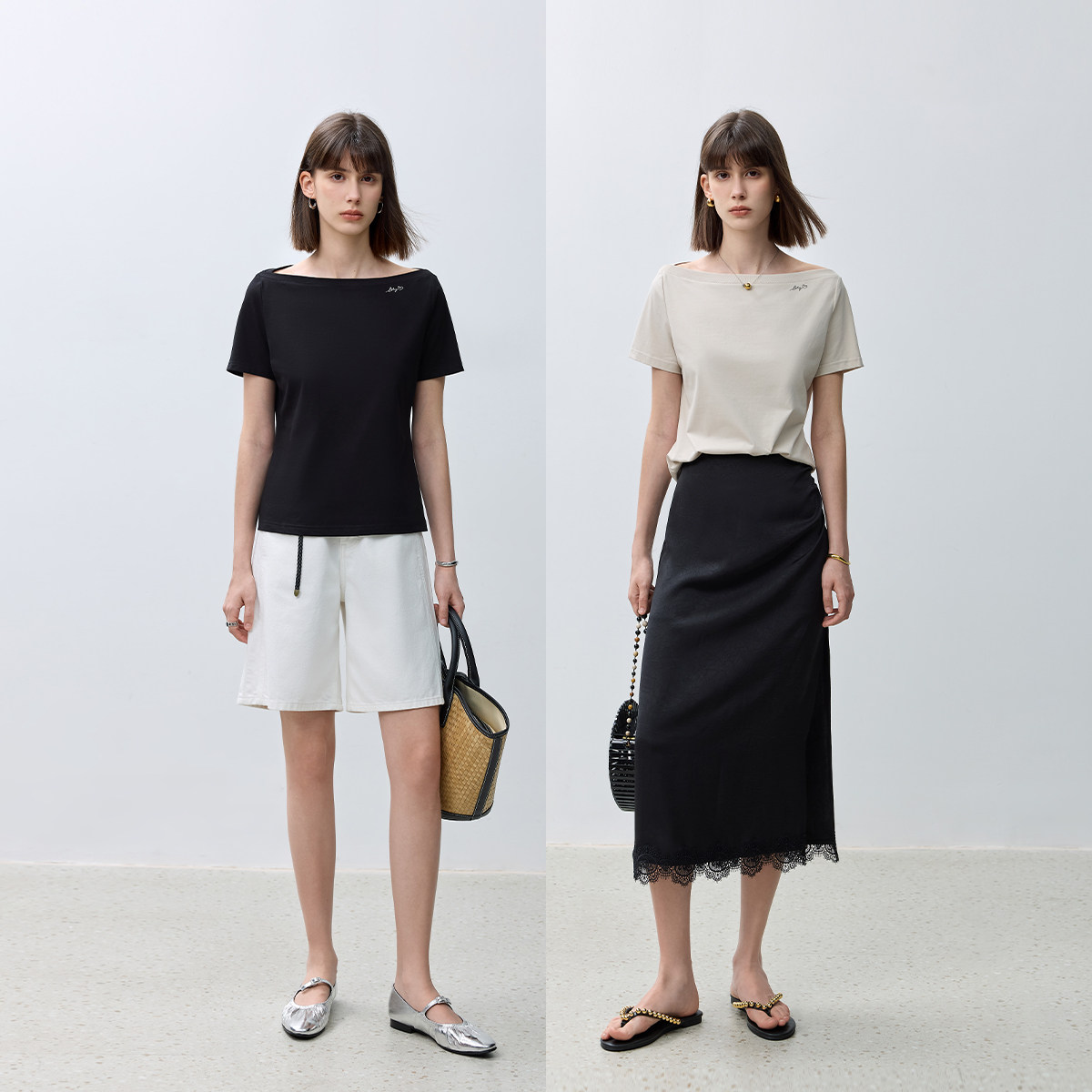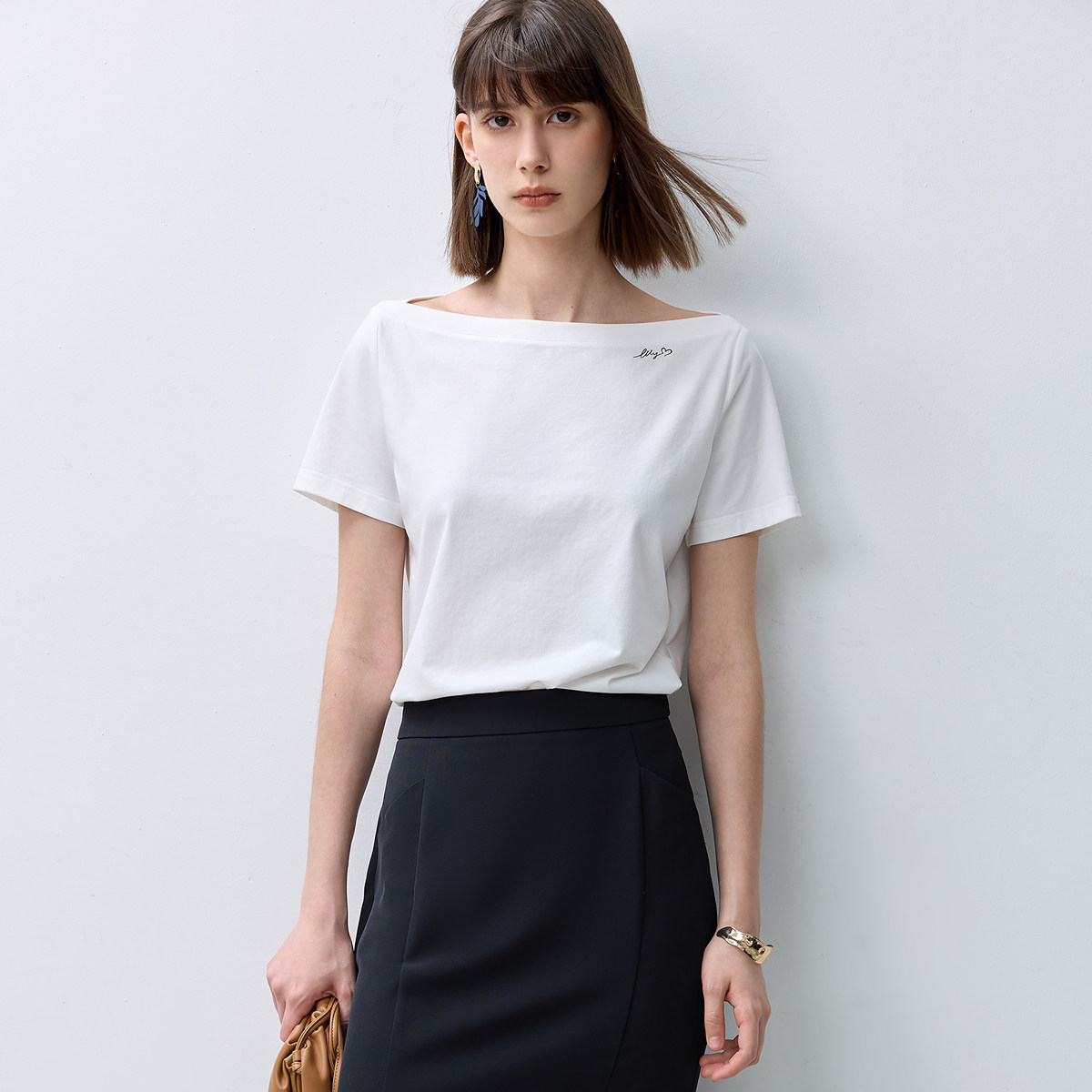LILY25新款时尚流行一字领都市通勤基础T恤合身夏日白色短袖上衣