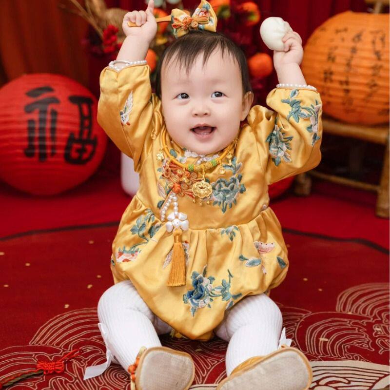 周岁女宝礼服中式旗袍金色百天宝宝连体抓周宴冠衣春夏季高端唐装