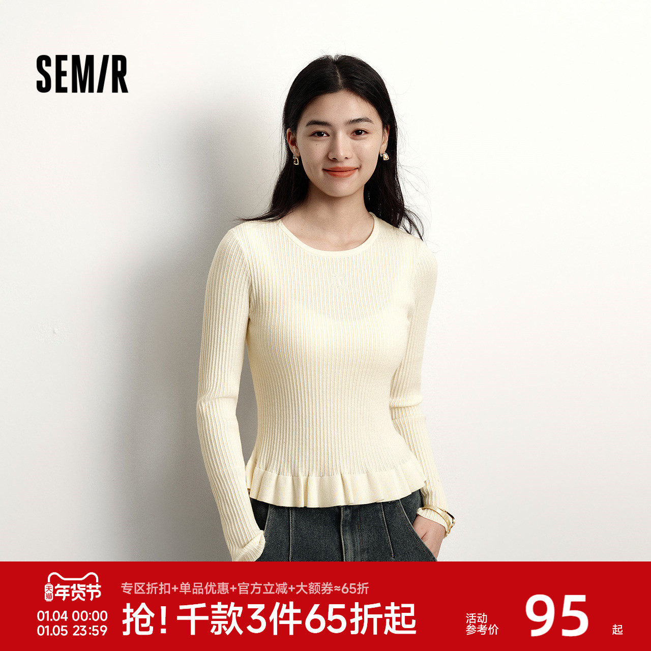 森柔|森马针织衫女冬季花边紧身打底衫白色2025新款少女套头毛衫