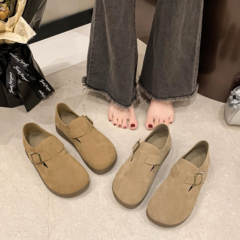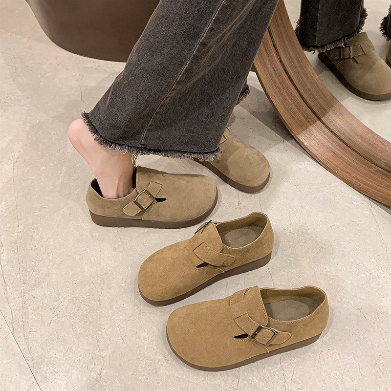 磨砂牛皮松糕厚底大头勃肯鞋女复古真皮圆头增高一脚蹬懒人毛毛鞋