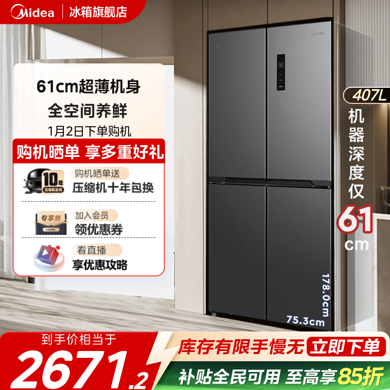 美的407L十字双开对开四门超薄款电冰箱家用小型一级能效风冷无霜