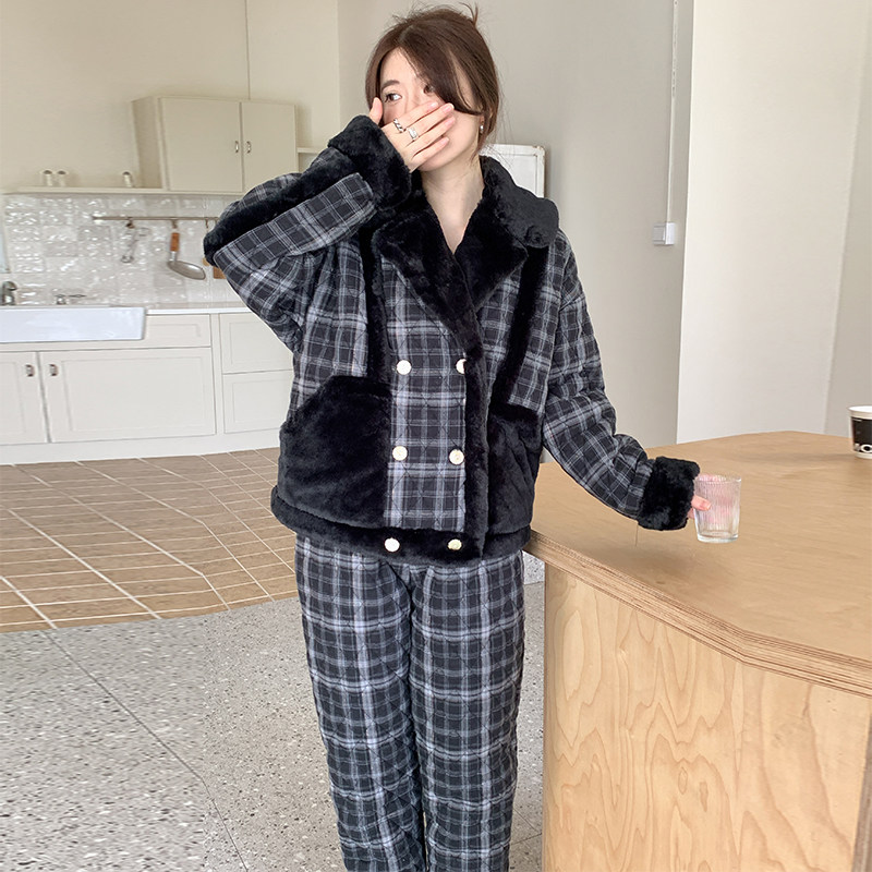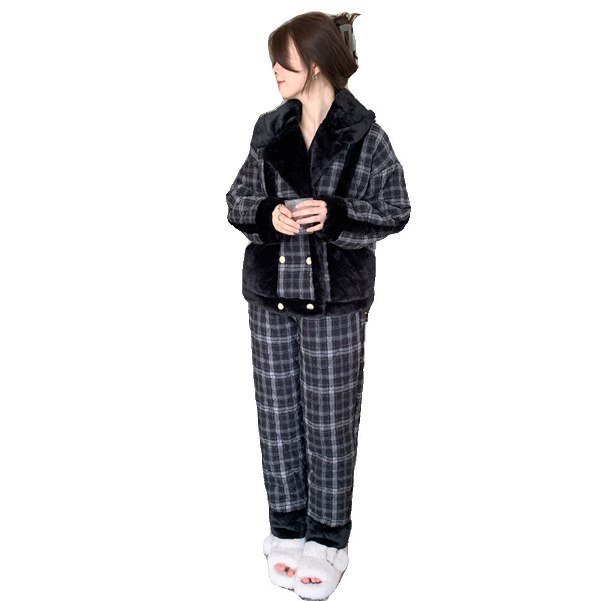 睡衣女士冬季三层夹棉长袖法兰绒套装加厚保暖珊瑚绒可外穿家居服