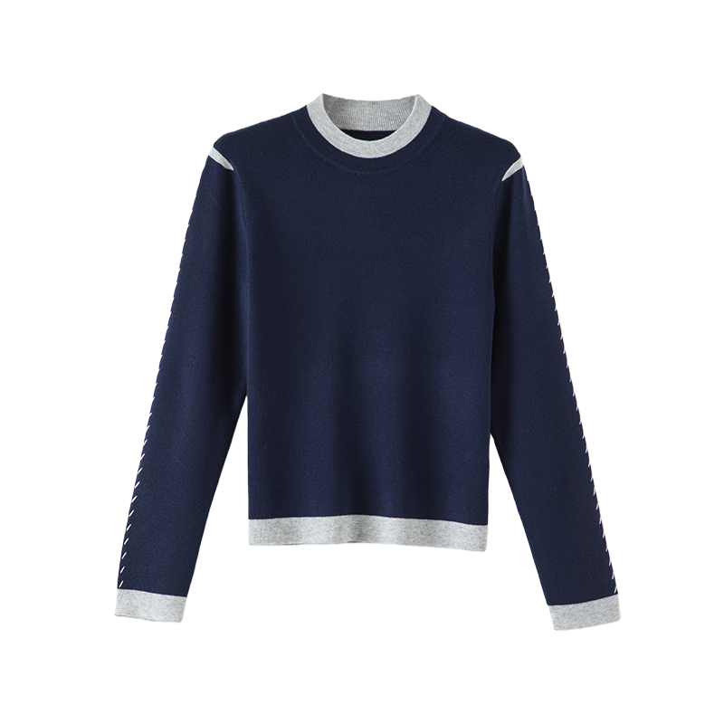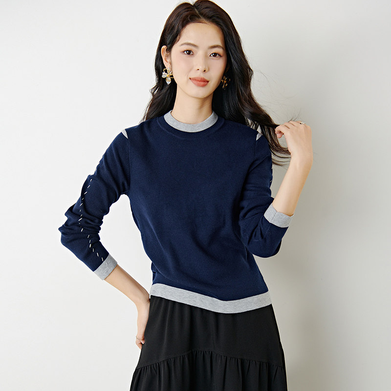 晚白2026年春新款时尚撞色圆领毛衣亲肤舒适修身百搭针织衫女