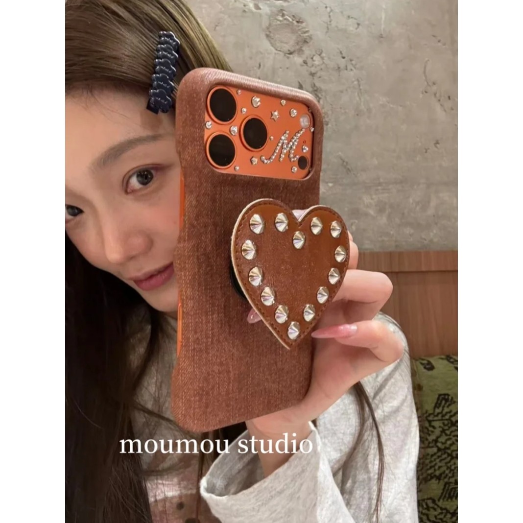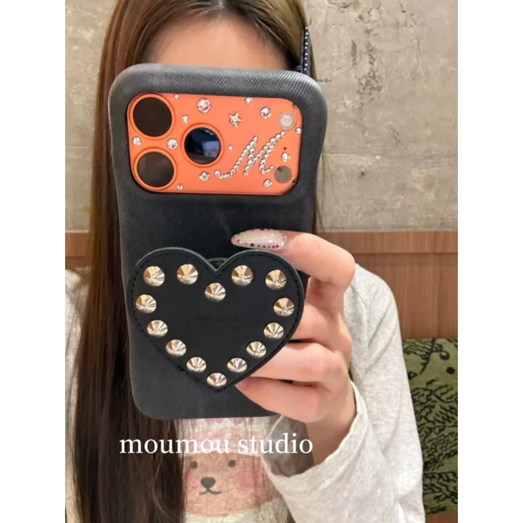 MOMOMOSTUDIOS韩系ins深色皮纹铆钉爱心支架适用iPhone17promax新款16pro苹果手机壳15pro皮纹14全包13软壳