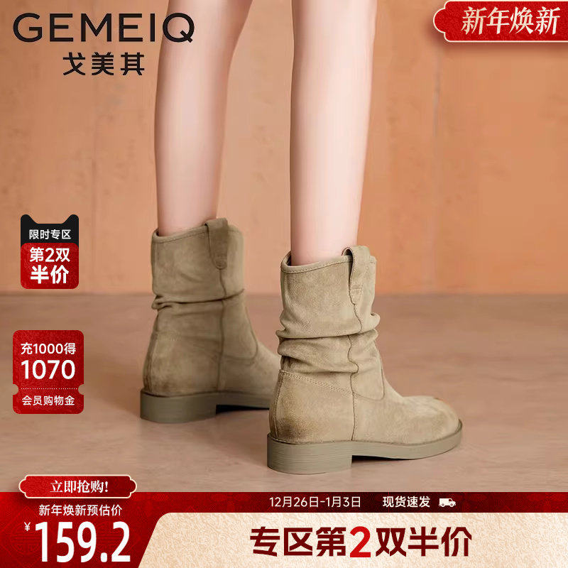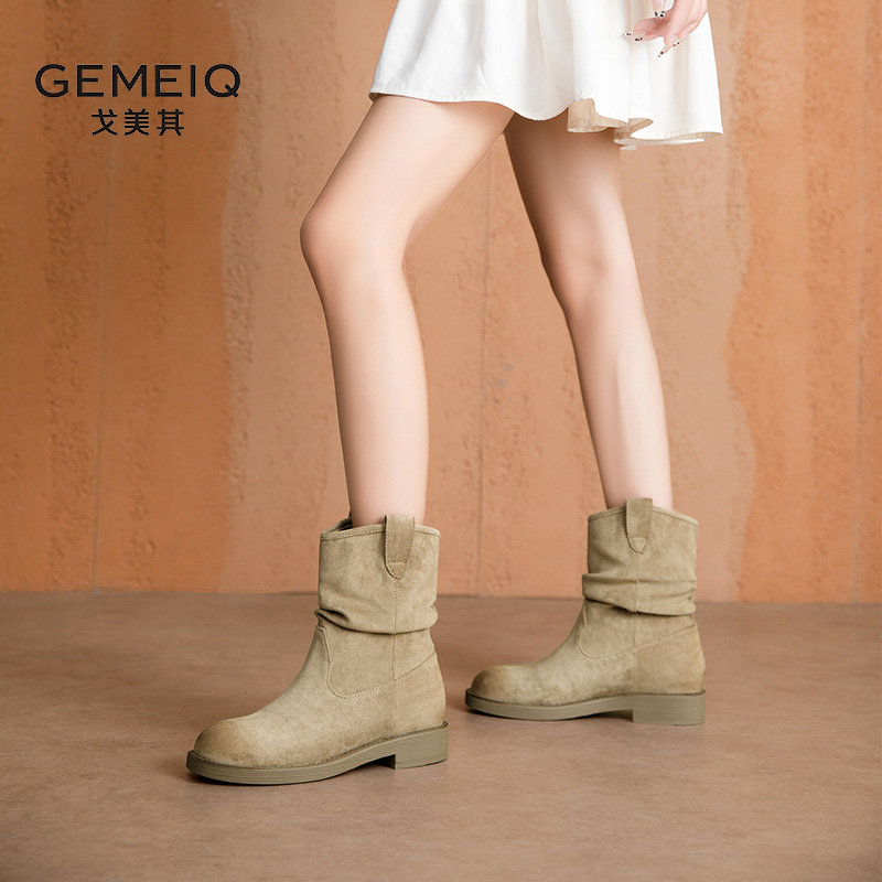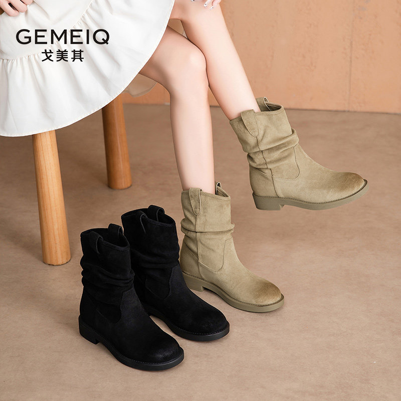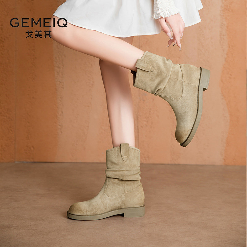 戈美其堆堆靴女款舒适新款春秋绒面瘦瘦靴褶皱美拉德棕色靴子短靴