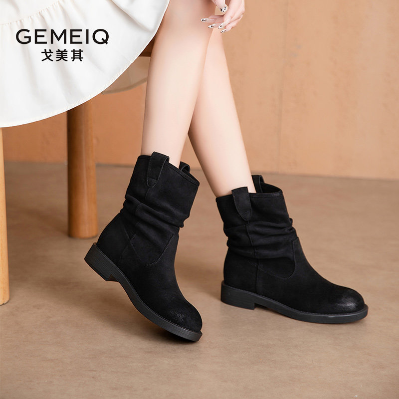 真皮~内增高黑色中筒裤管靴女秋西部牛仔骑士靴厚底褶皱堆堆长靴
