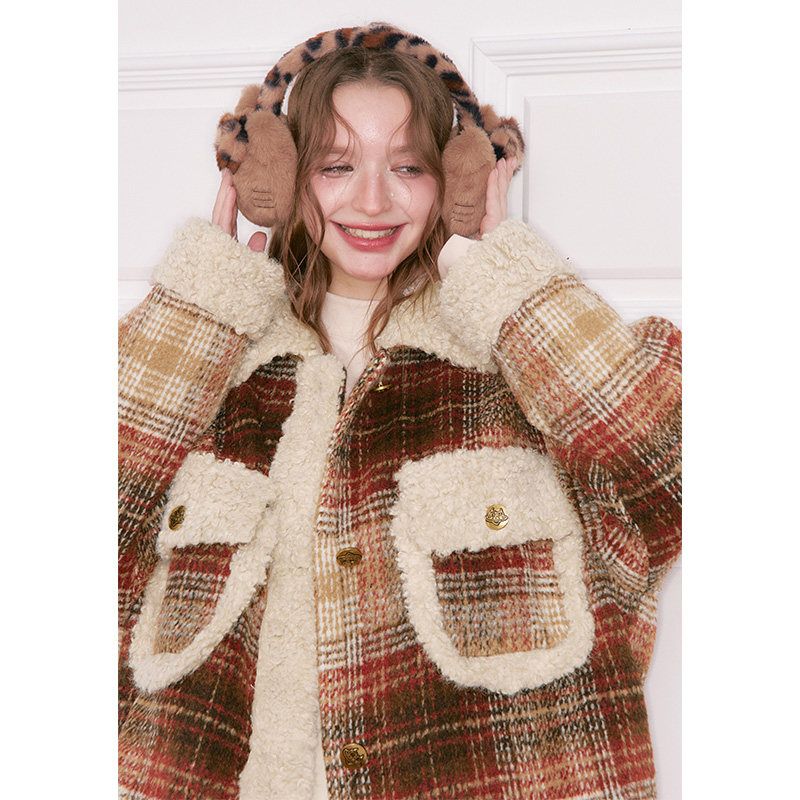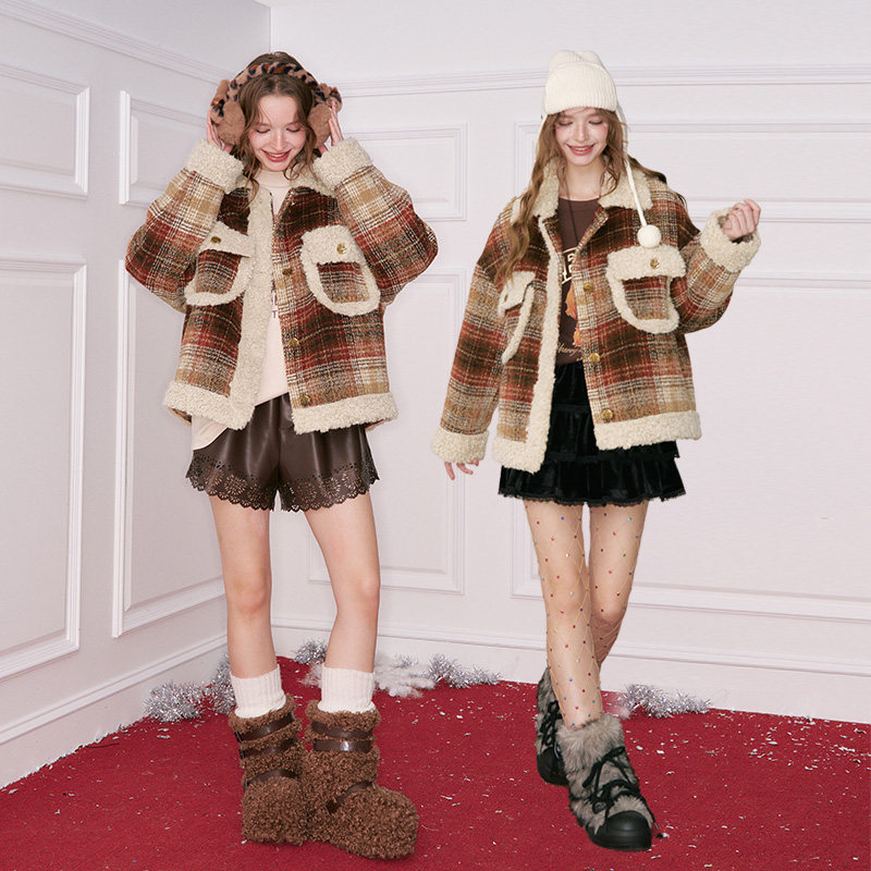 妖精的口袋仿毛绒格纹拼接夹棉短款毛呢外套女2025冬新款新年战袍