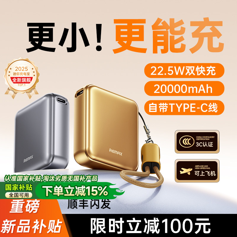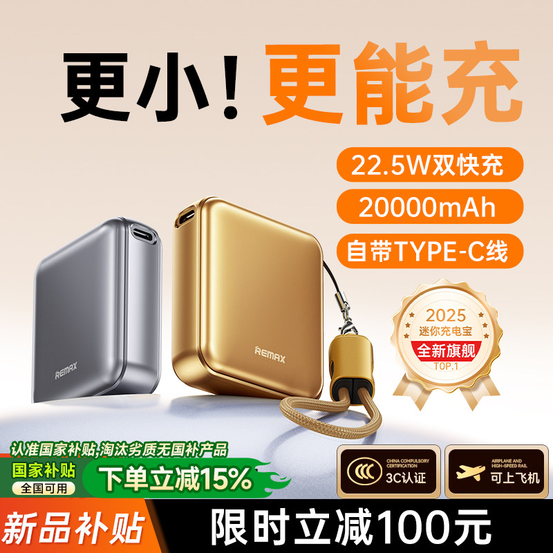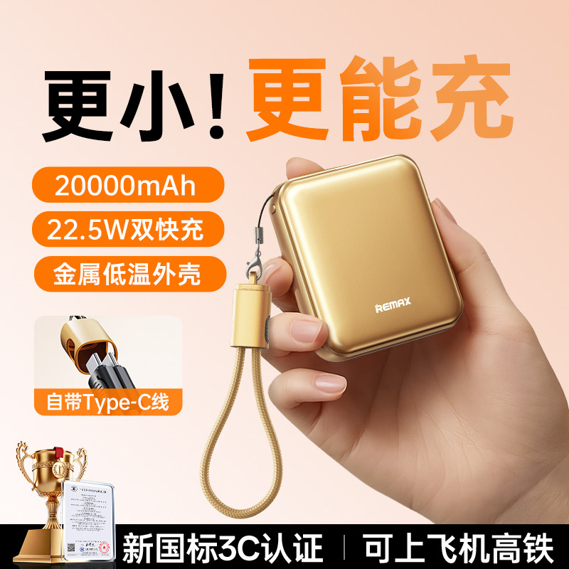 【新国标3C认证】remax睿量2025新款充电宝超薄小巧便携迷你自带线快充大容量10000毫安飞机可携带适用于苹果