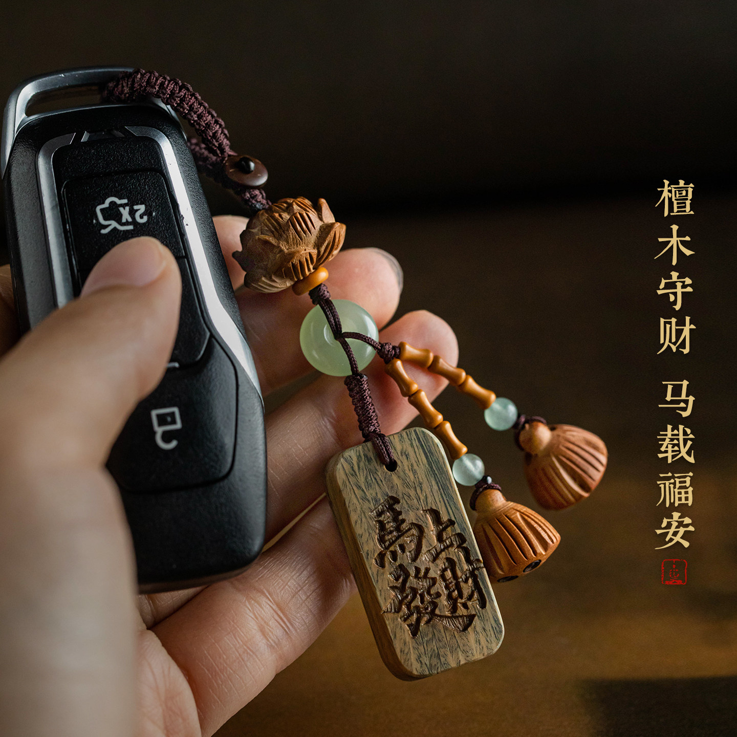 大善堂绿檀木方形车钥匙挂件天然檀木钥匙扣木质莲花送礼物男挂饰