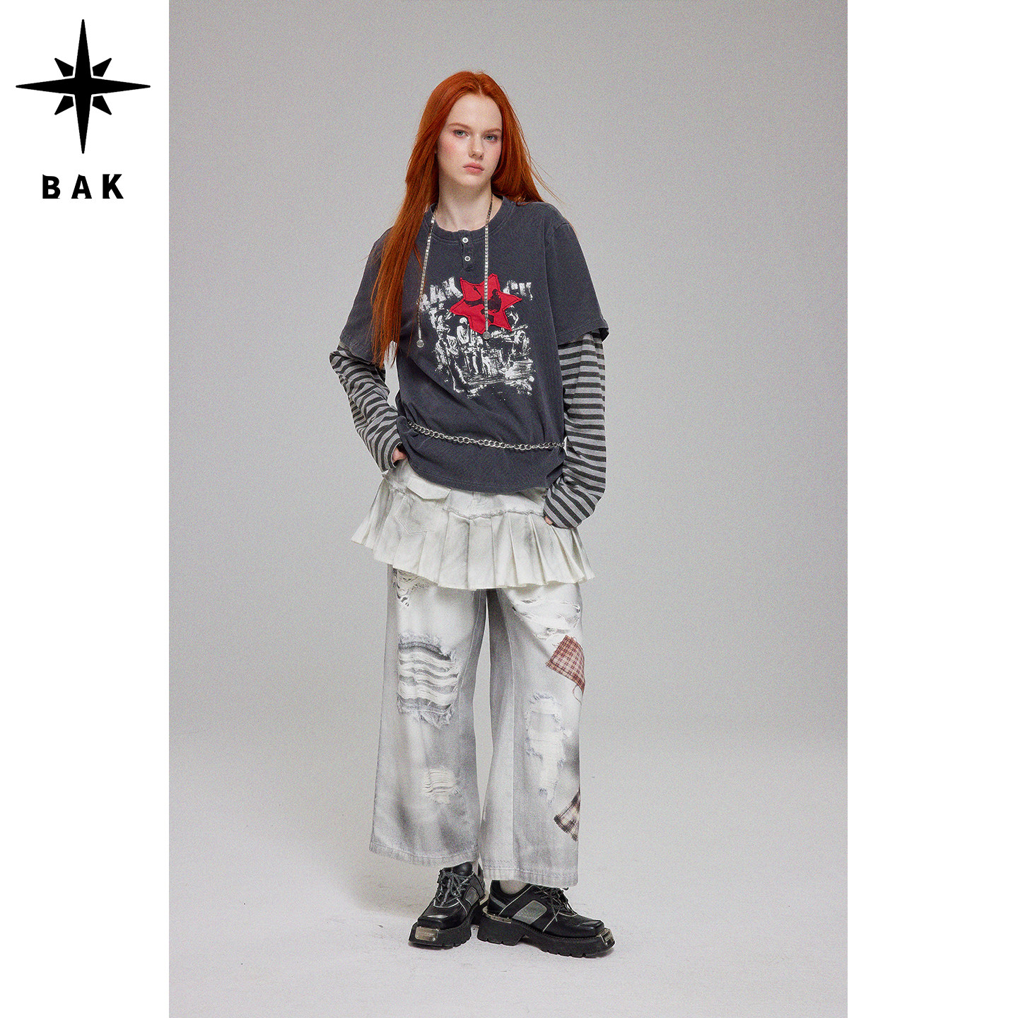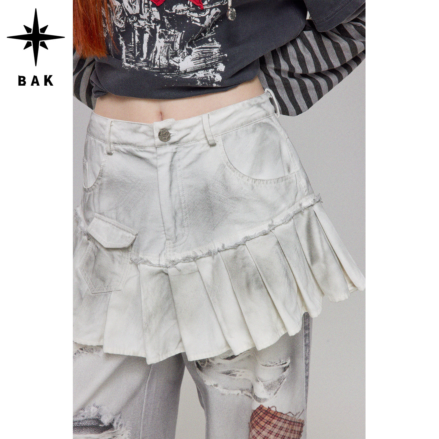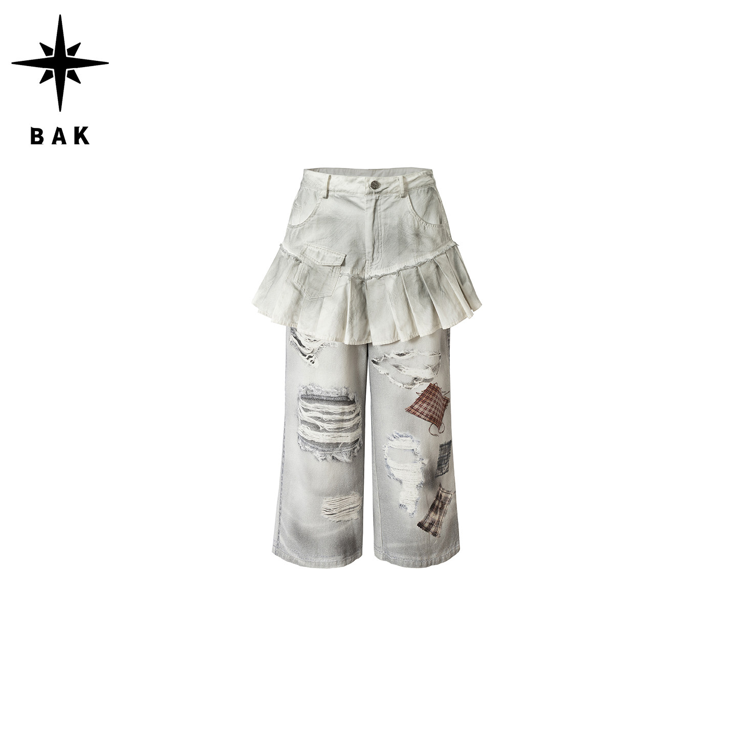 BAK原创设计 “尘封折痕”假两件数码印花喷脏水洗百褶裙裤女长裤