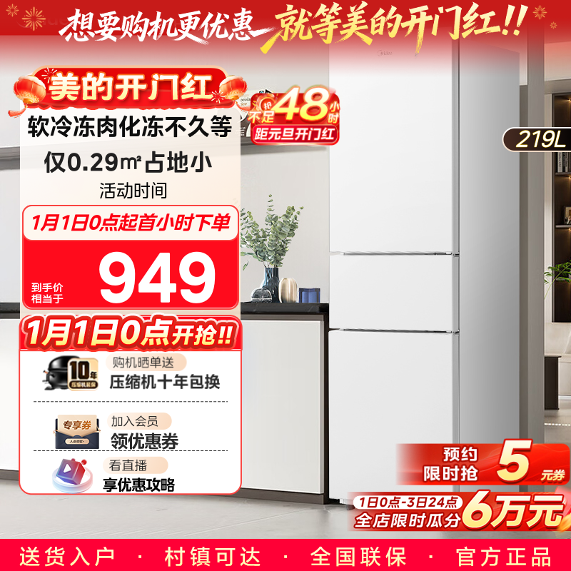 美的230三开门白色超薄家用小型宿舍租房冷藏电冰箱官方节能低音