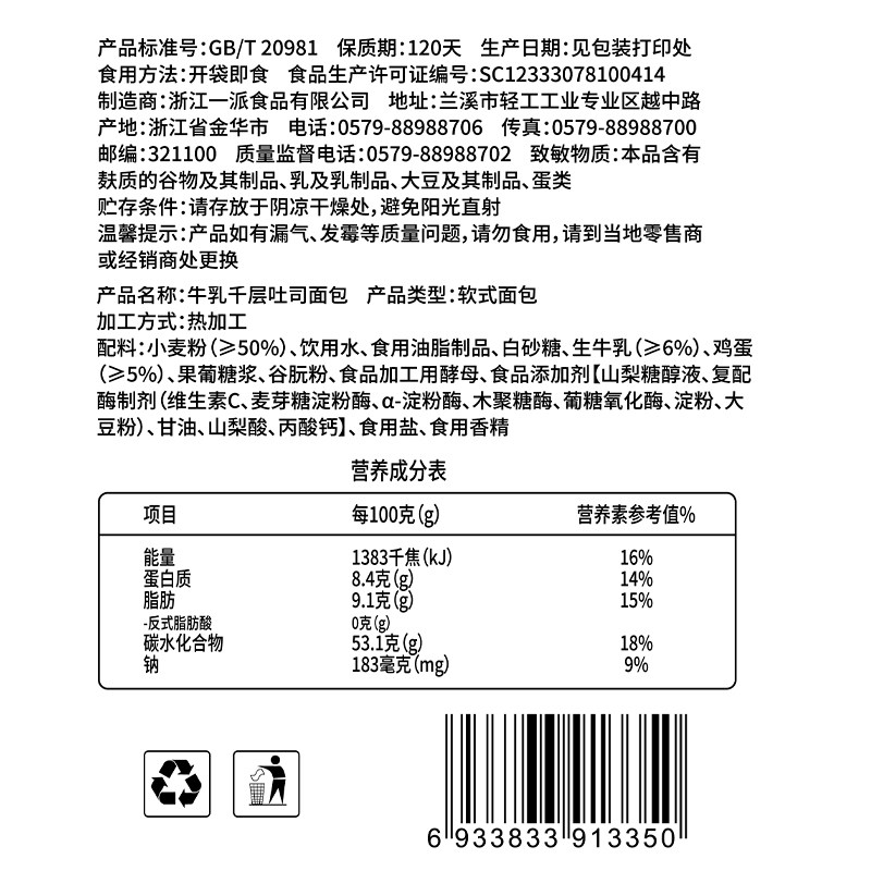 【百补99】熊治水牛乳千层吐司手撕面包整箱早代餐点心儿童零食