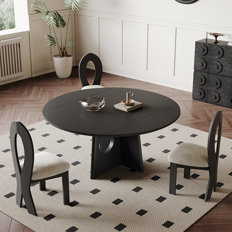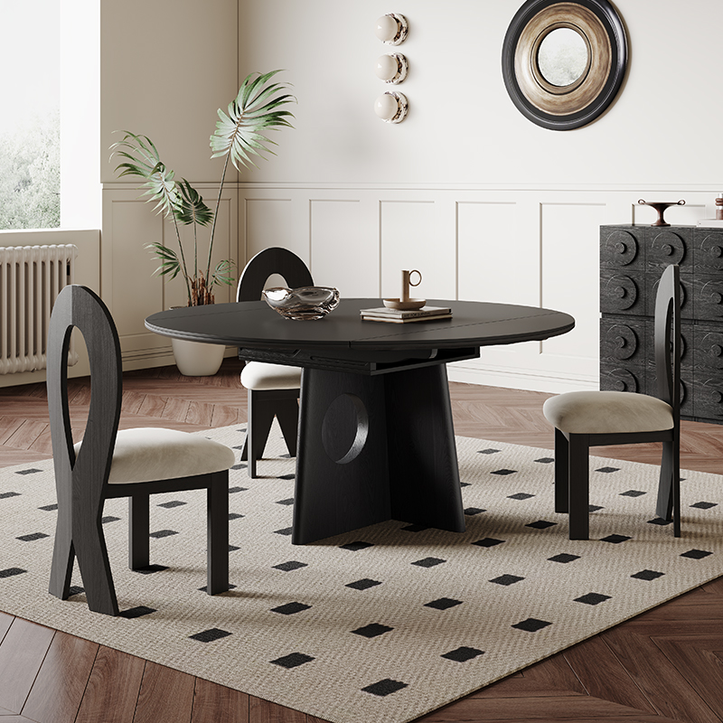 黑色伸缩岩板餐桌复古风方圆两用圆桌意式进口白蜡木实木岩板餐桌