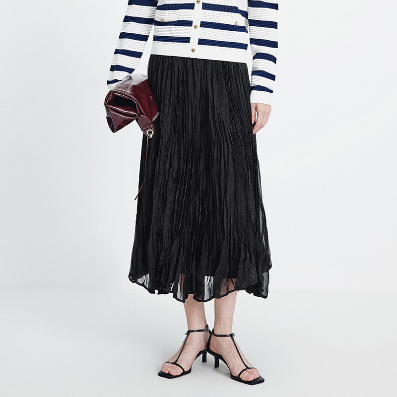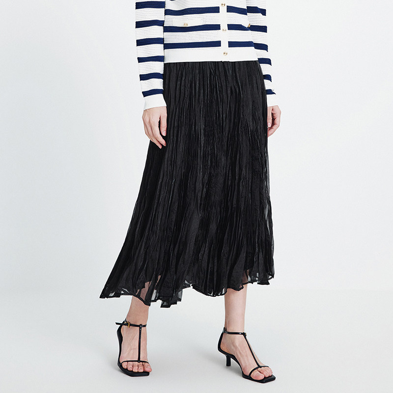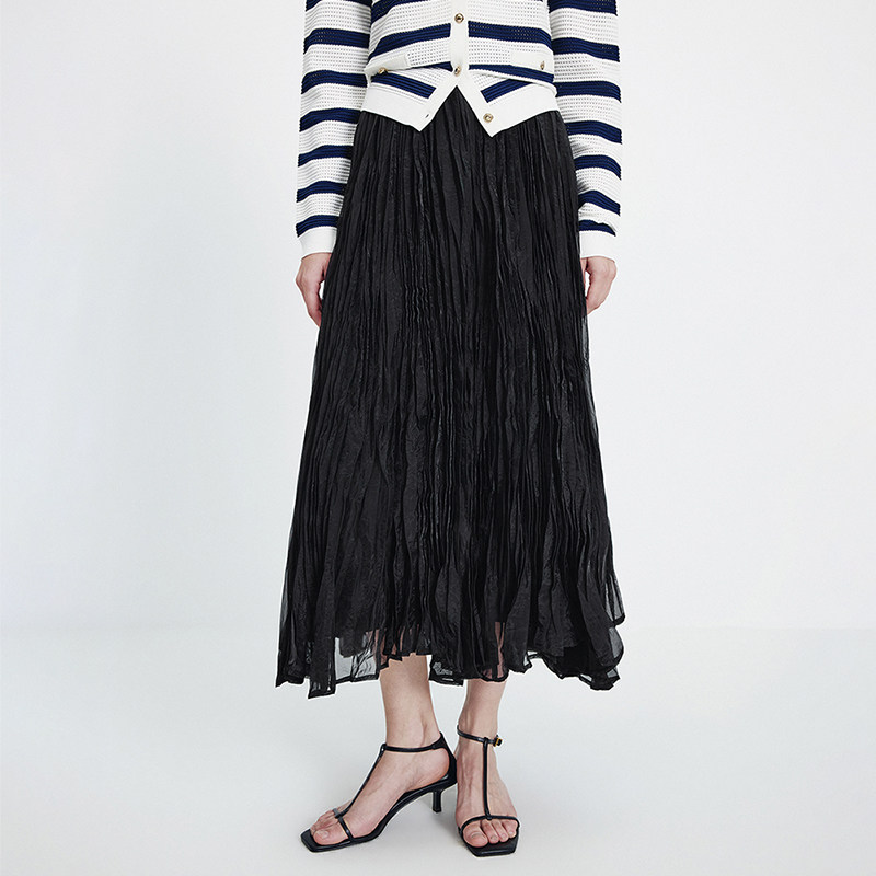 Navigare意大利小帆船黑色网纱半身裙女2026春夏显瘦A字百褶长裙