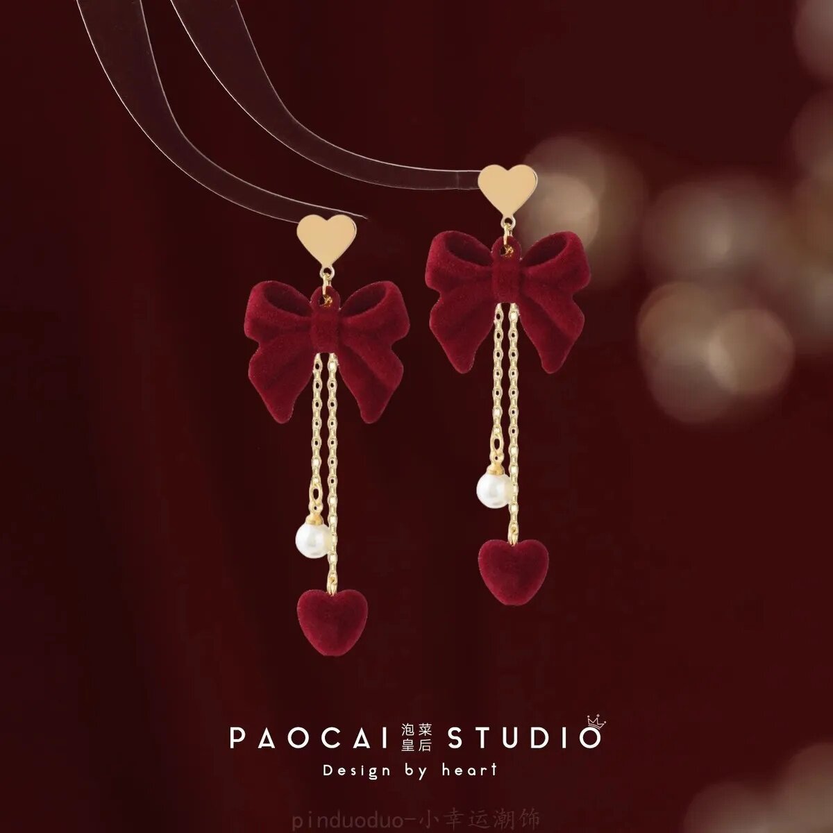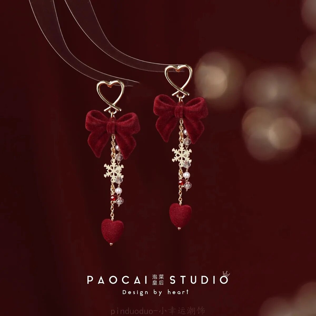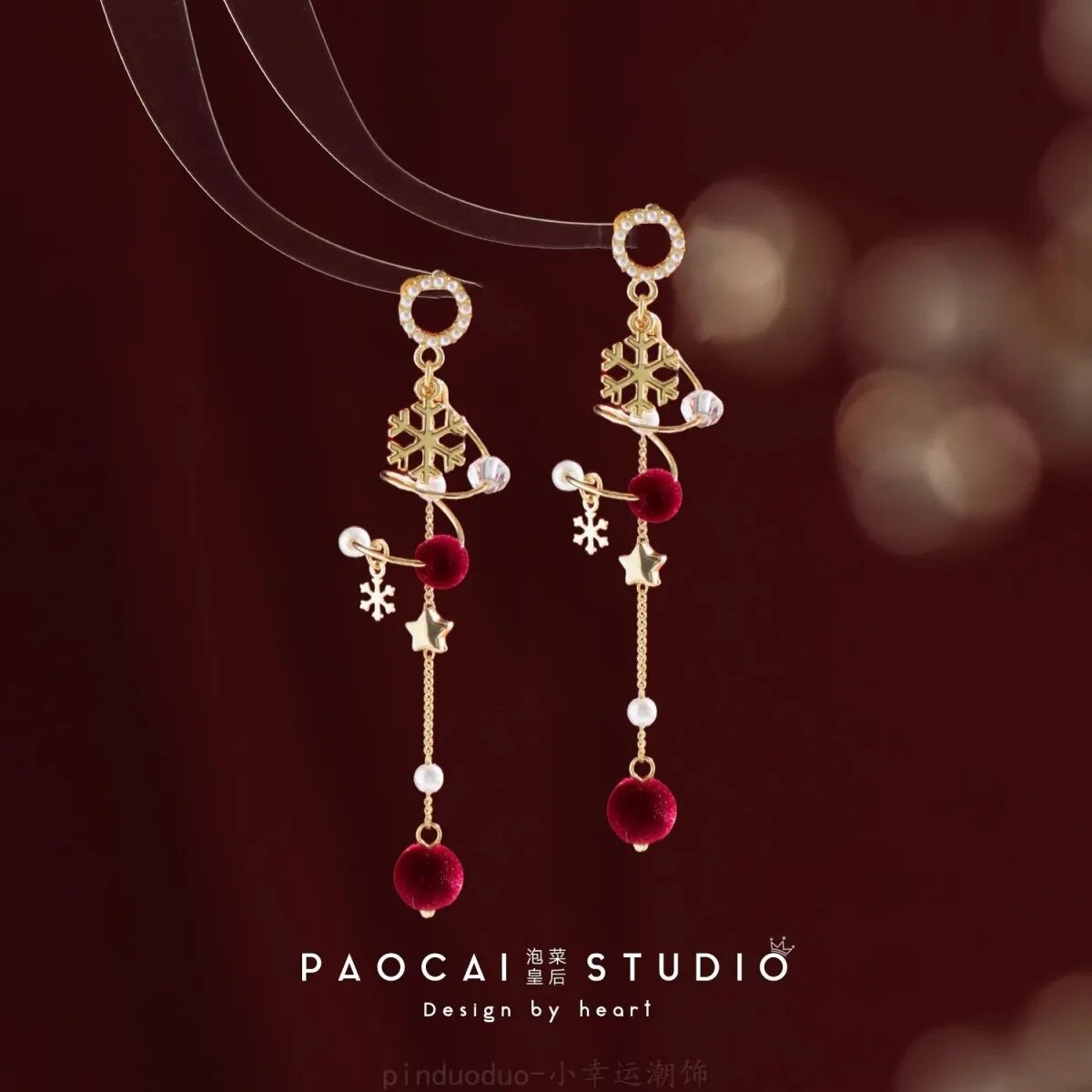 原创新年红色耳饰一串植绒风铃花朵耳钉过年结婚流苏高级感耳环女