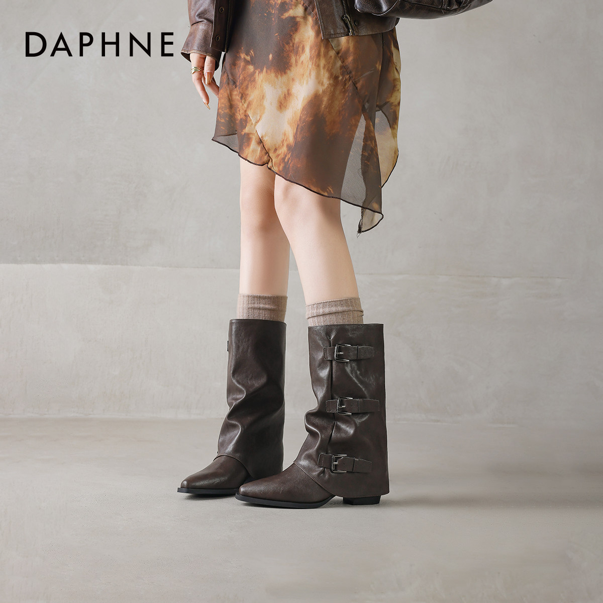 达芙妮尖头棕色中筒女靴子2026新款女款裤管巨好看秋冬季骑士皮靴