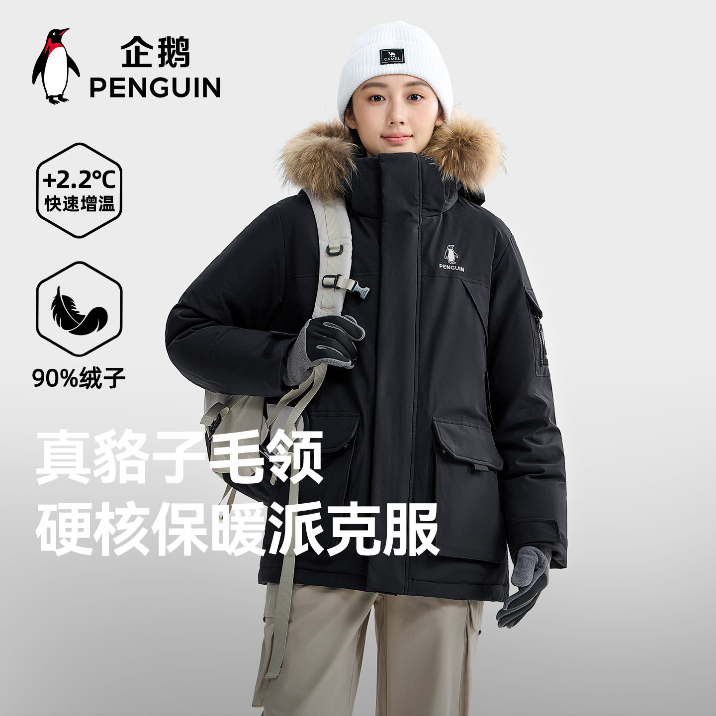 「Baby同款」企鹅可拆卸骆子毛领工装派克羽绒服女2025冬外套男女
