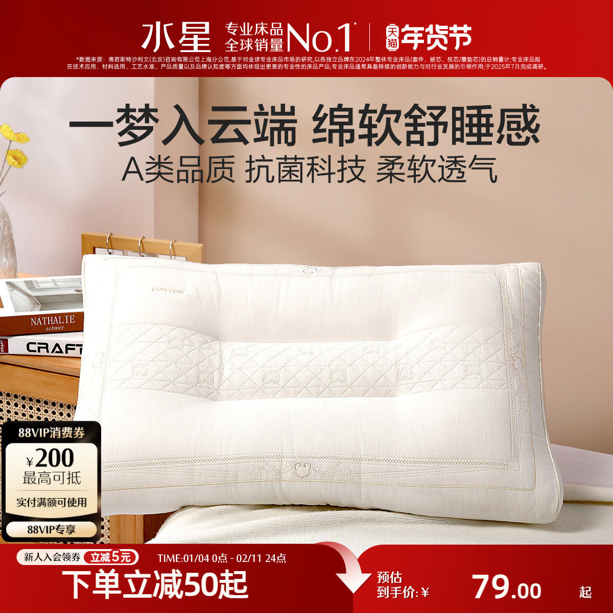 水星家纺A类抗菌枕头单人枕呵护颈椎枕棉花单只装枕芯床上用品