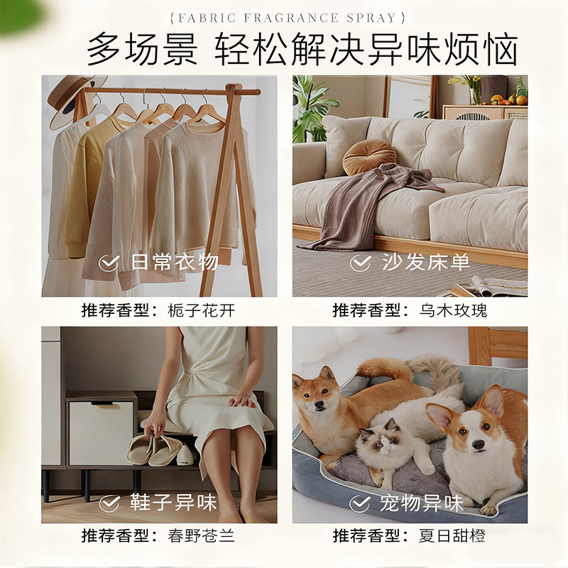 衣物香氛护衣除臭喷雾持久留香衣物免洗防静电消毒抑菌除螨柔顺剂