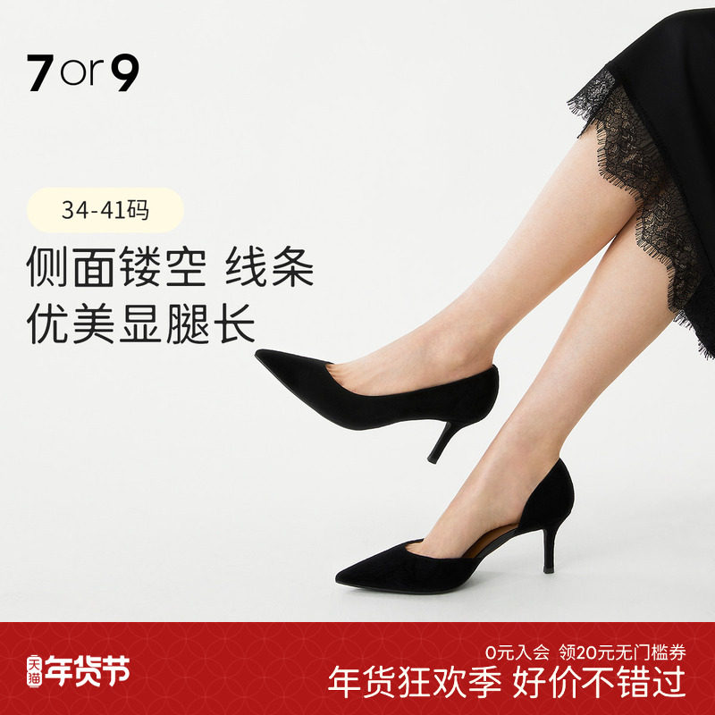 7or9黑色高跟鞋女鞋秋冬大码羊皮侧空气质尖头职业通勤单鞋黑米露