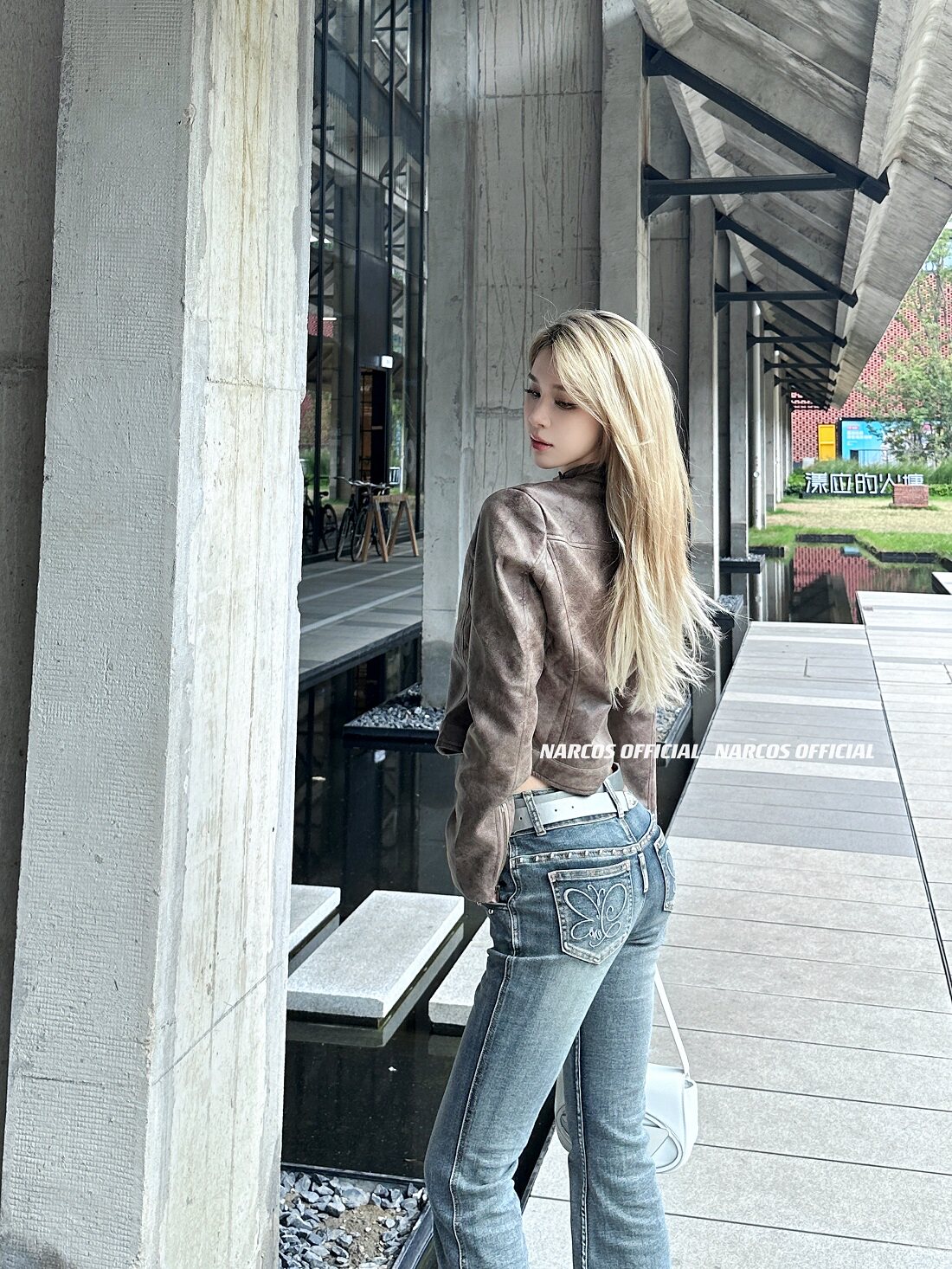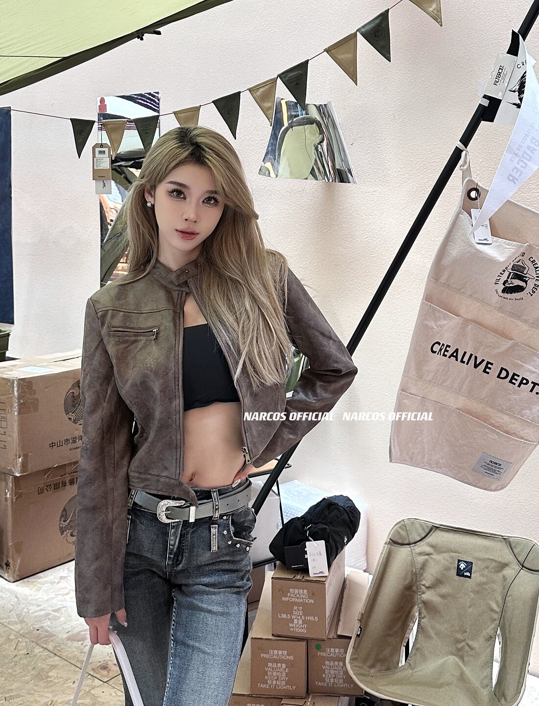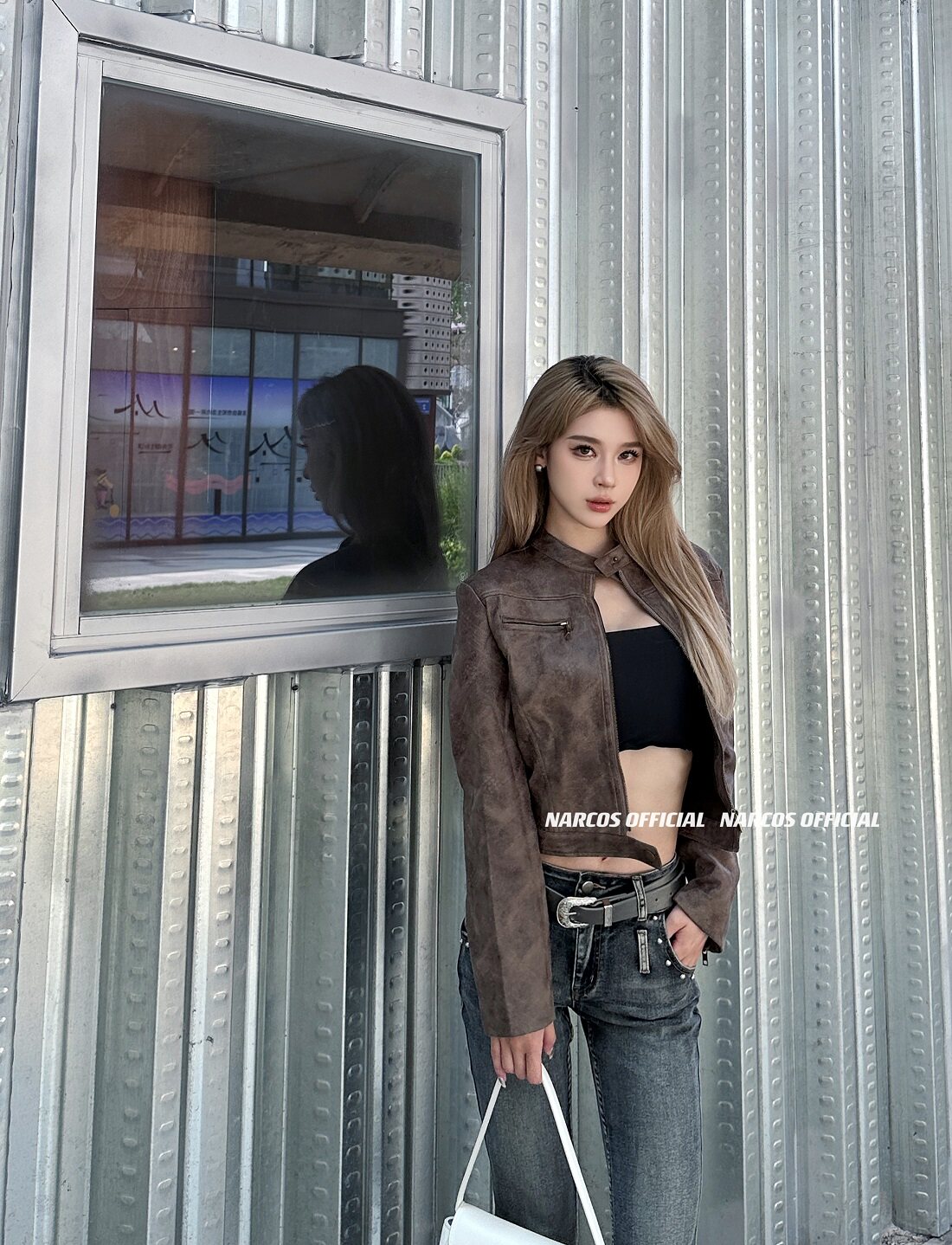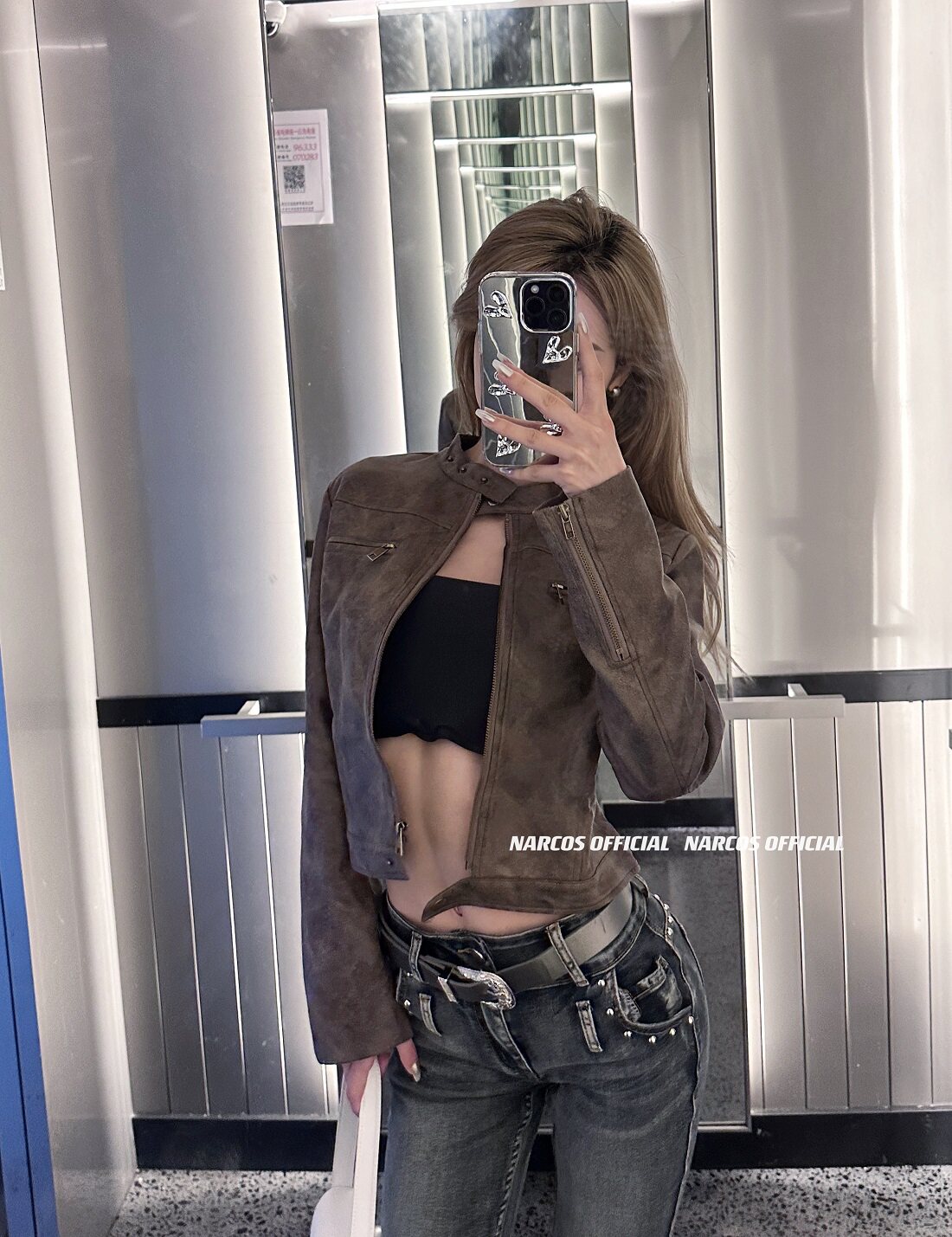 Narcos【美拉德】Lioness平替水洗做旧麂皮衣短款辣妹拉链外套女