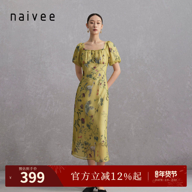 naivee纳薇夏国风高级新中式复古印花泡泡袖度假连衣裙