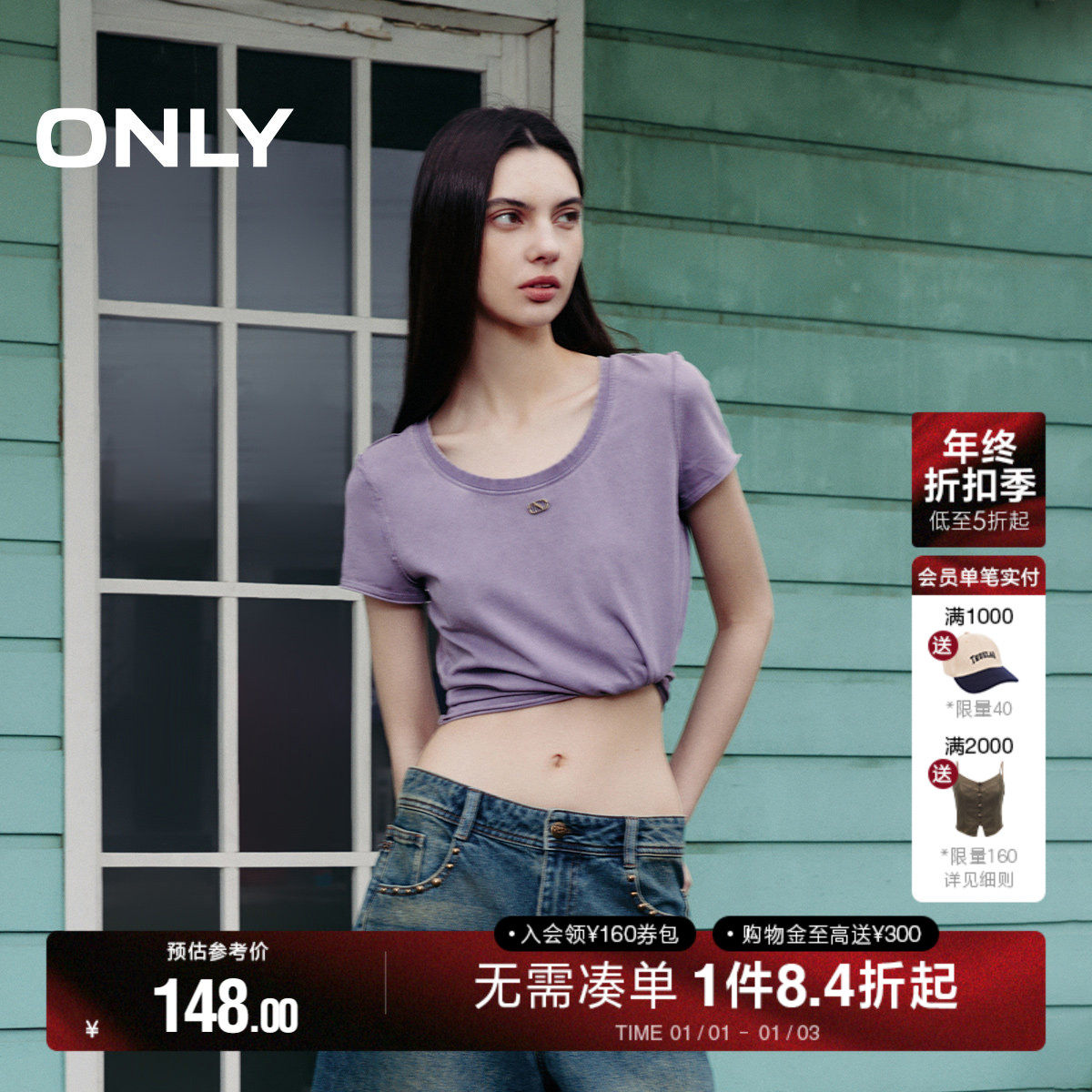 ONLY2025夏季新款辣妹复古美式做旧正肩修身显瘦圆领短款T恤女