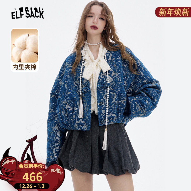 妖精的口袋蓝底银纹新中式棉衣女2025年冬季新款复古提花新年战袍