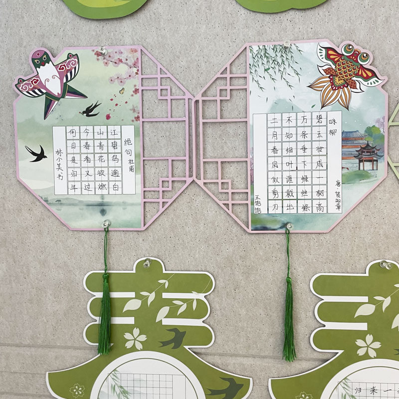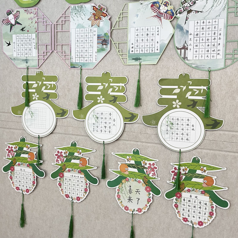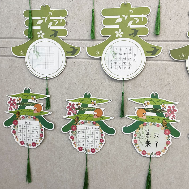 创意春天系列主题书法作品展示墙风筝绿色春字硬笔手写古诗练字彩色卡片纸小学生班级教室文化墙布置装饰挂卡