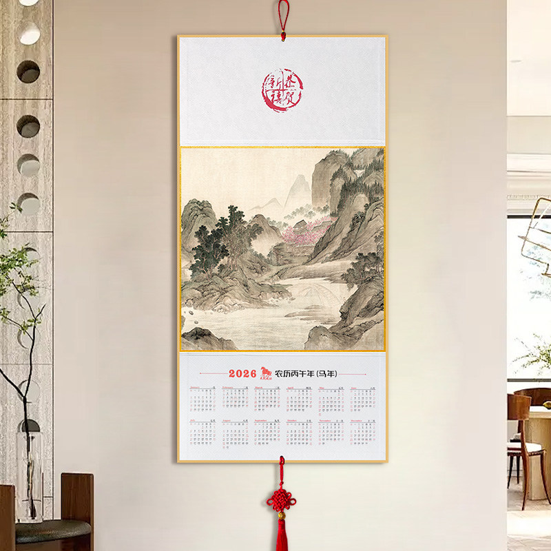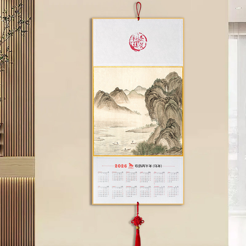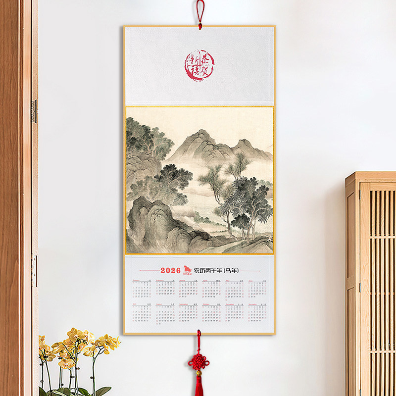 2026年宣纸折叠挂历湖山春暖图山水画装饰画免装裱日历卡纸国画水墨禅意圆形万年红硬卡纸文房挂件可定制批发