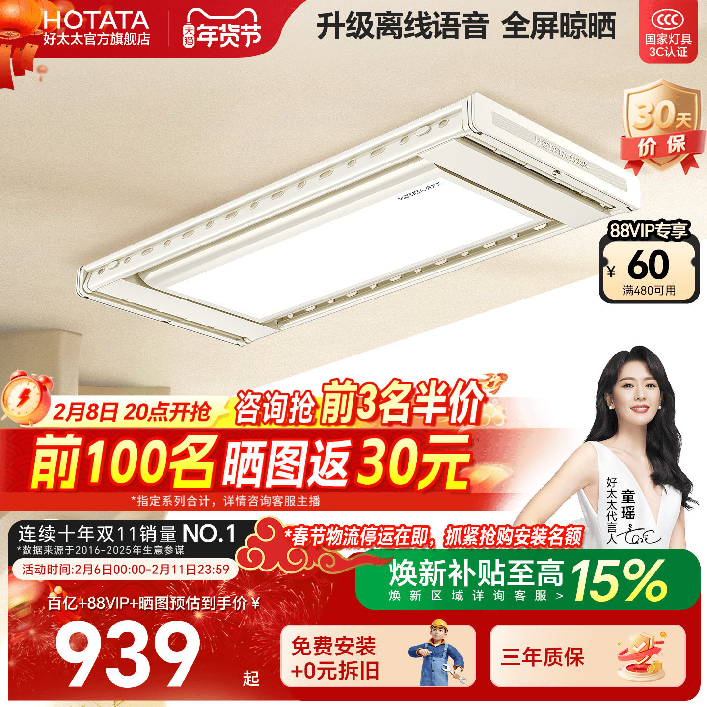太太乐智能电动晾衣架家用遥控自动升降阳台灯型隐藏嵌入式晒衣杆