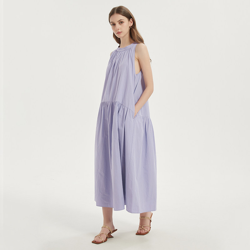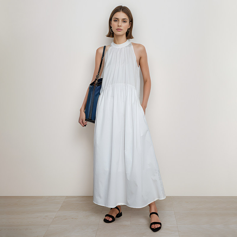 Petit Bari女士法式度假风挂脖连衣长裙 清新白色浅紫色