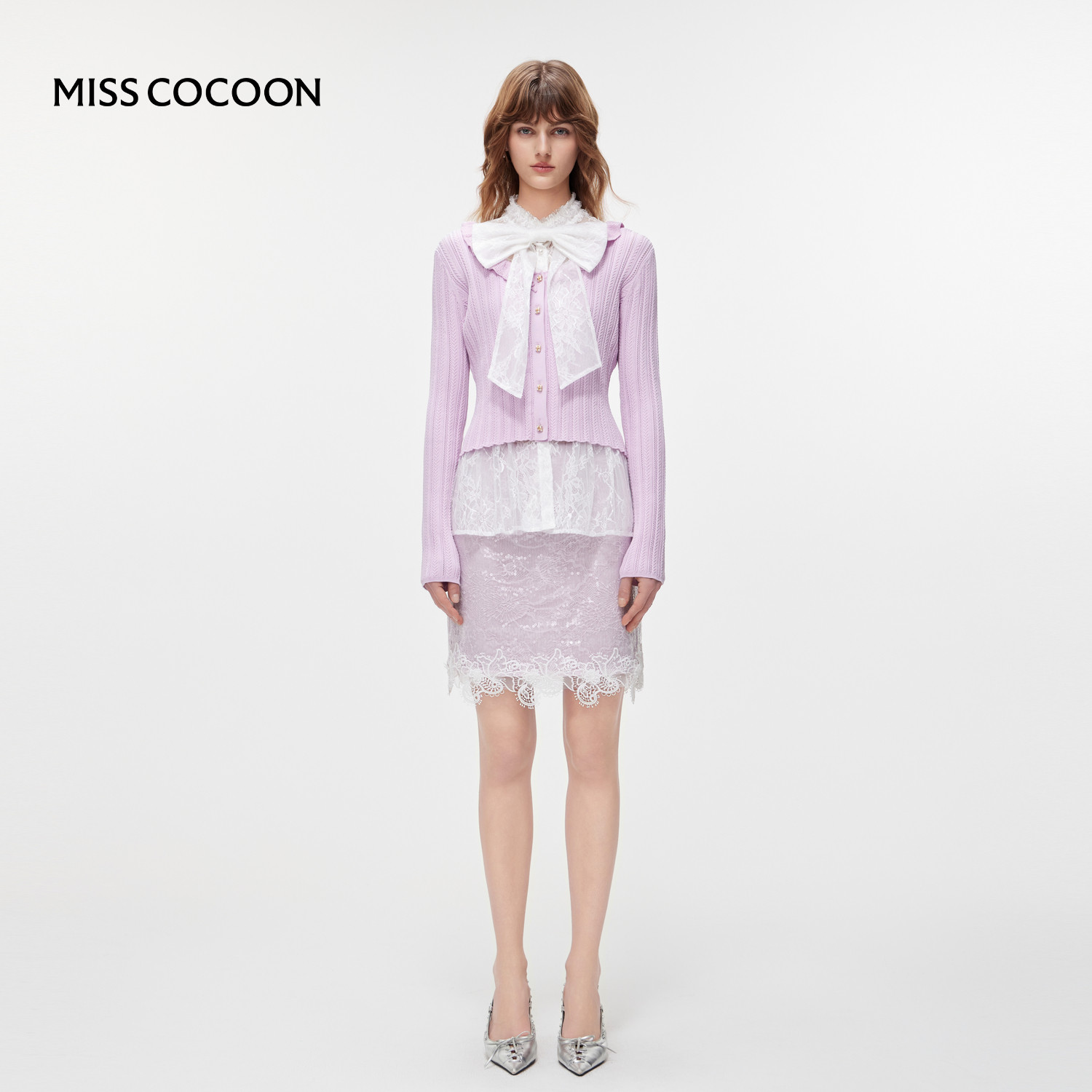 MISSCOCOON可可尼蕾丝打底衫女2026春季新款千金风紫色毛针织开衫