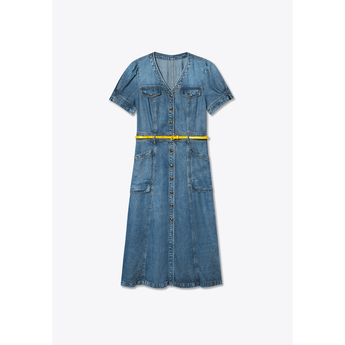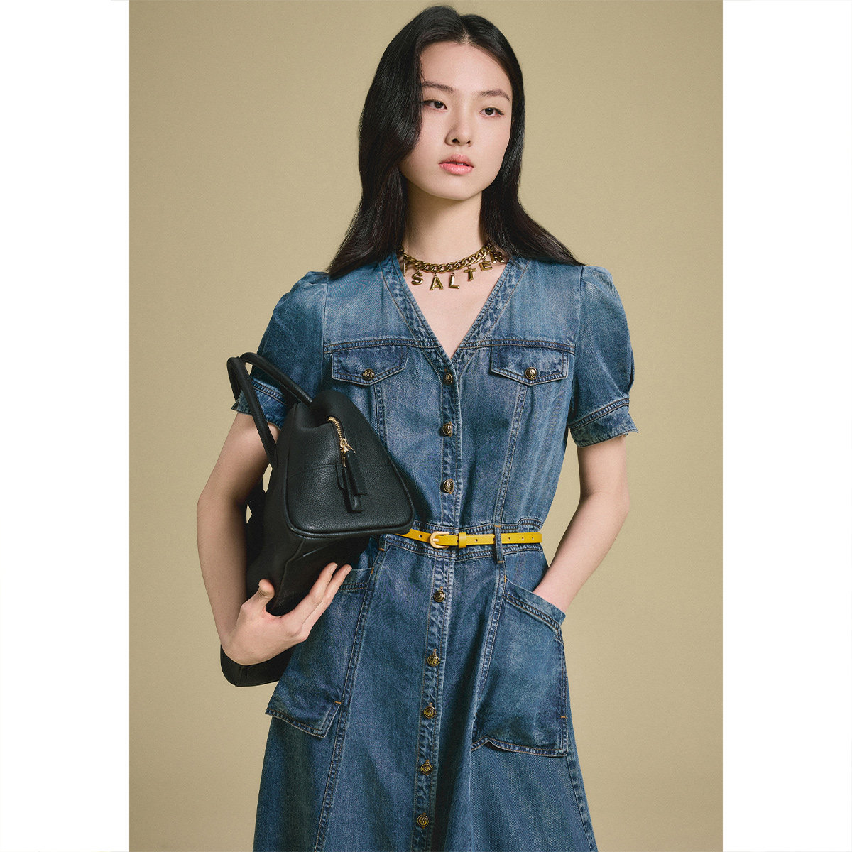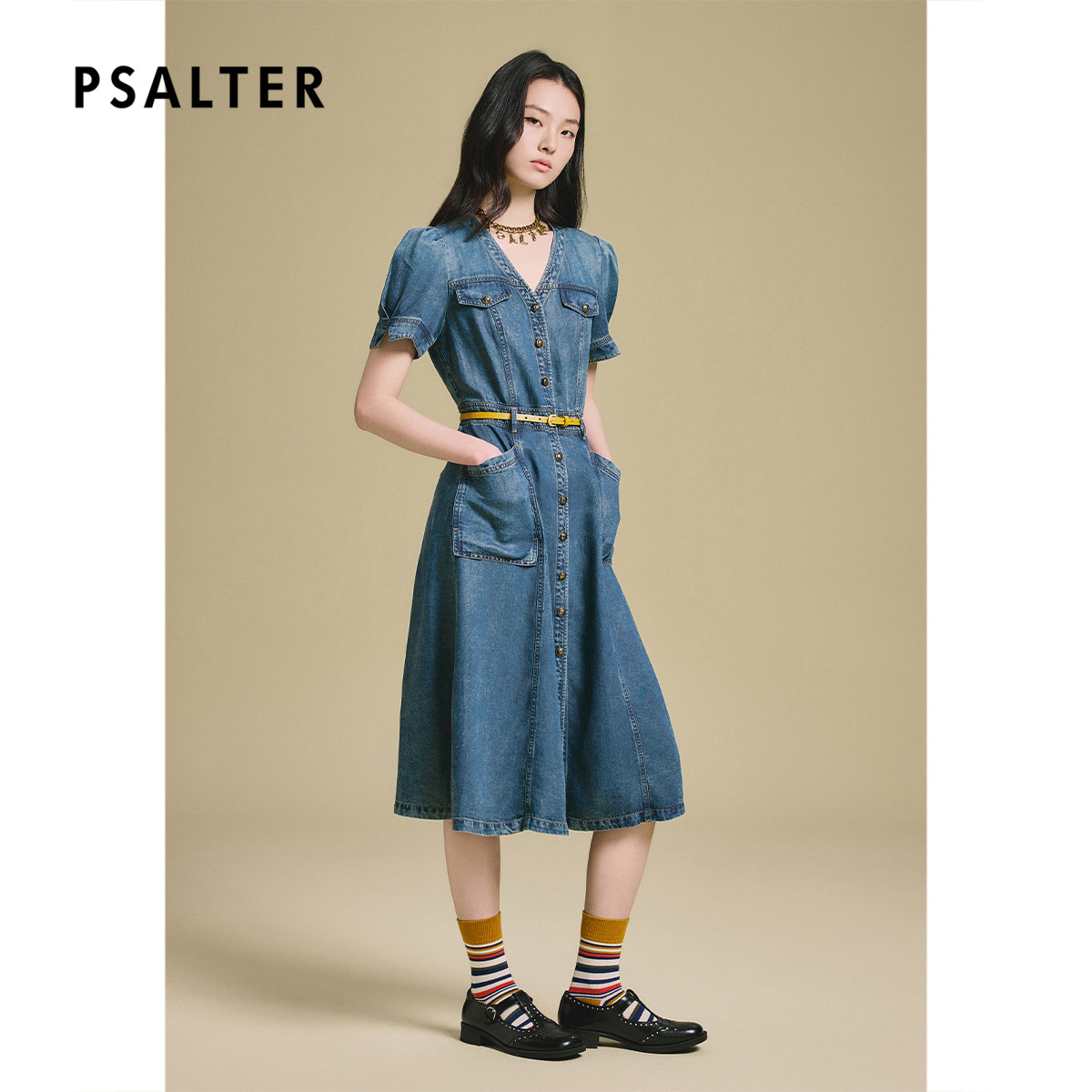 诗篇专选气质V领泡泡袖莱赛尔对称口袋牛仔连衣裙2025夏季新款