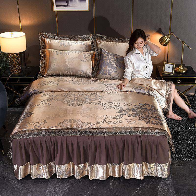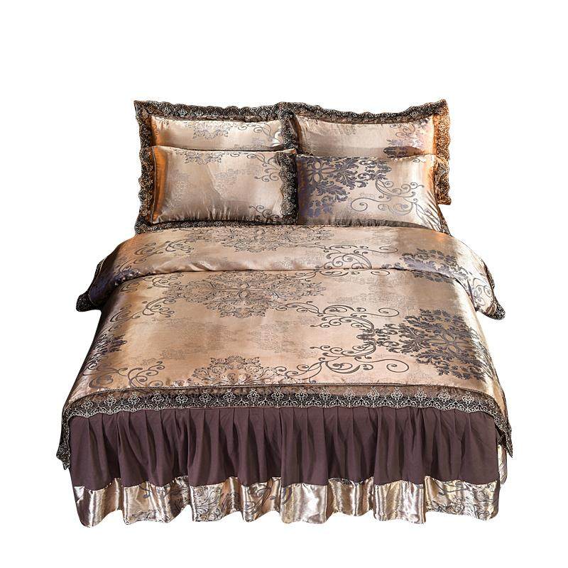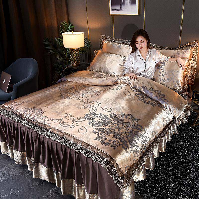 欧式床裙式四件套贡缎提花边被套纯棉床罩婚庆蕾丝绸床上用品