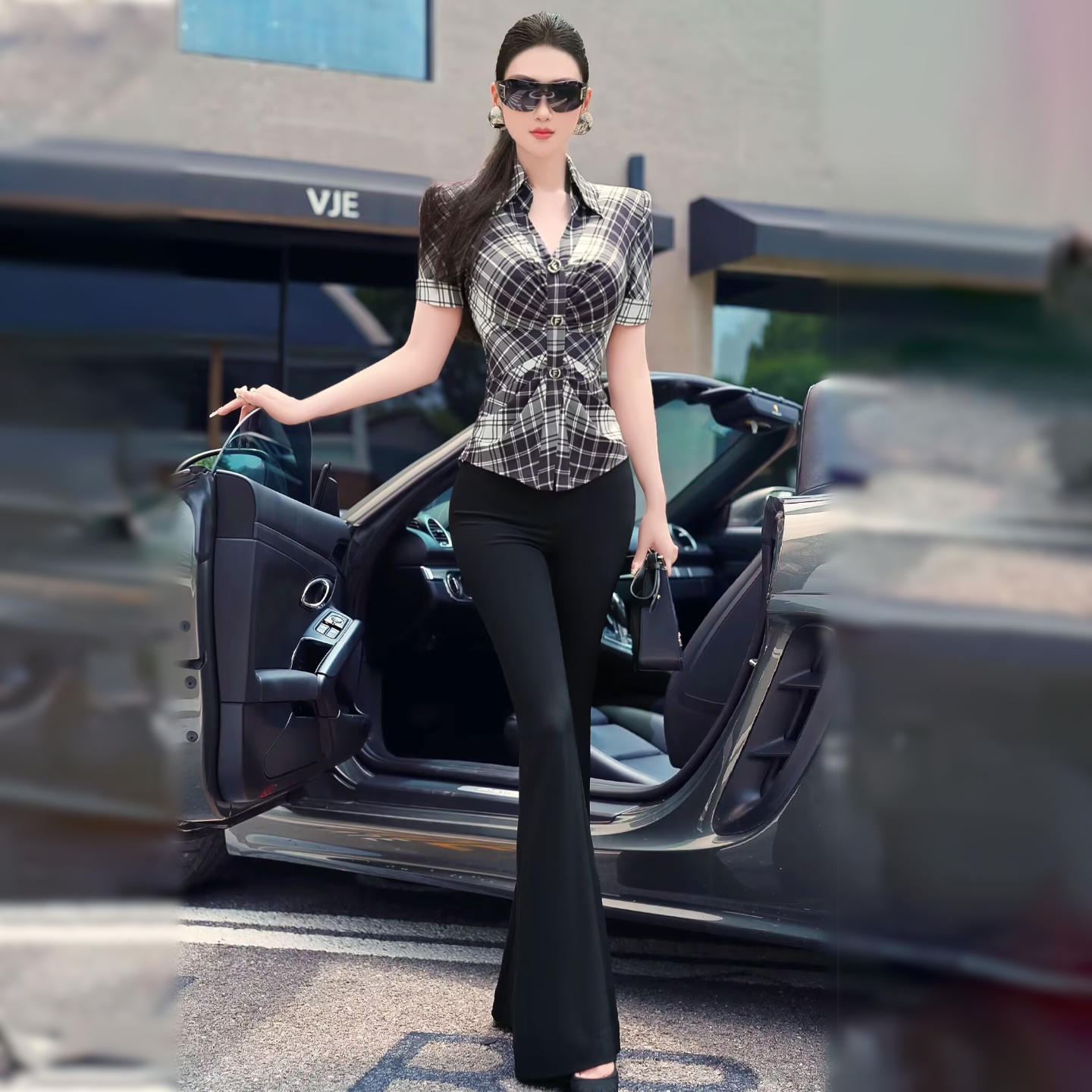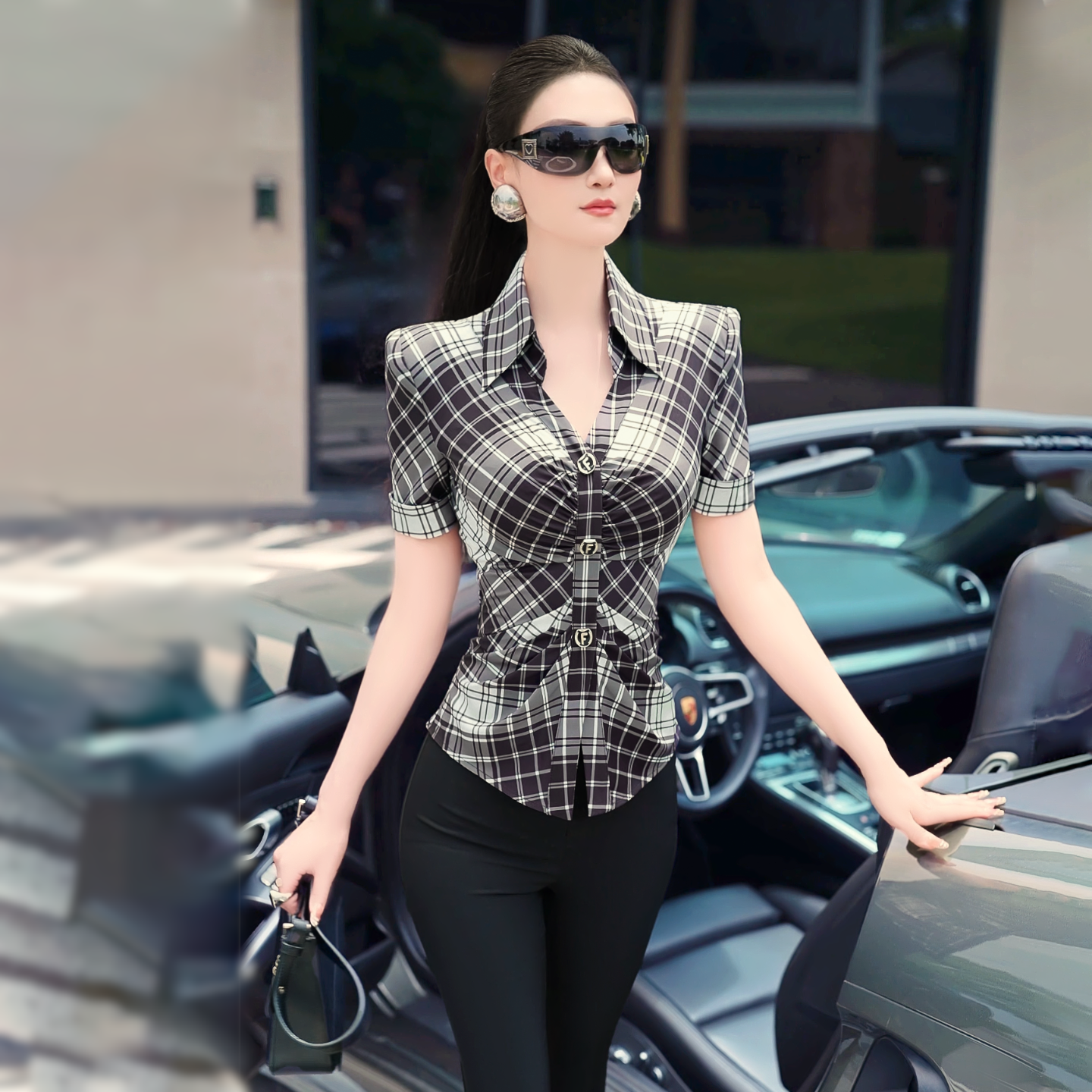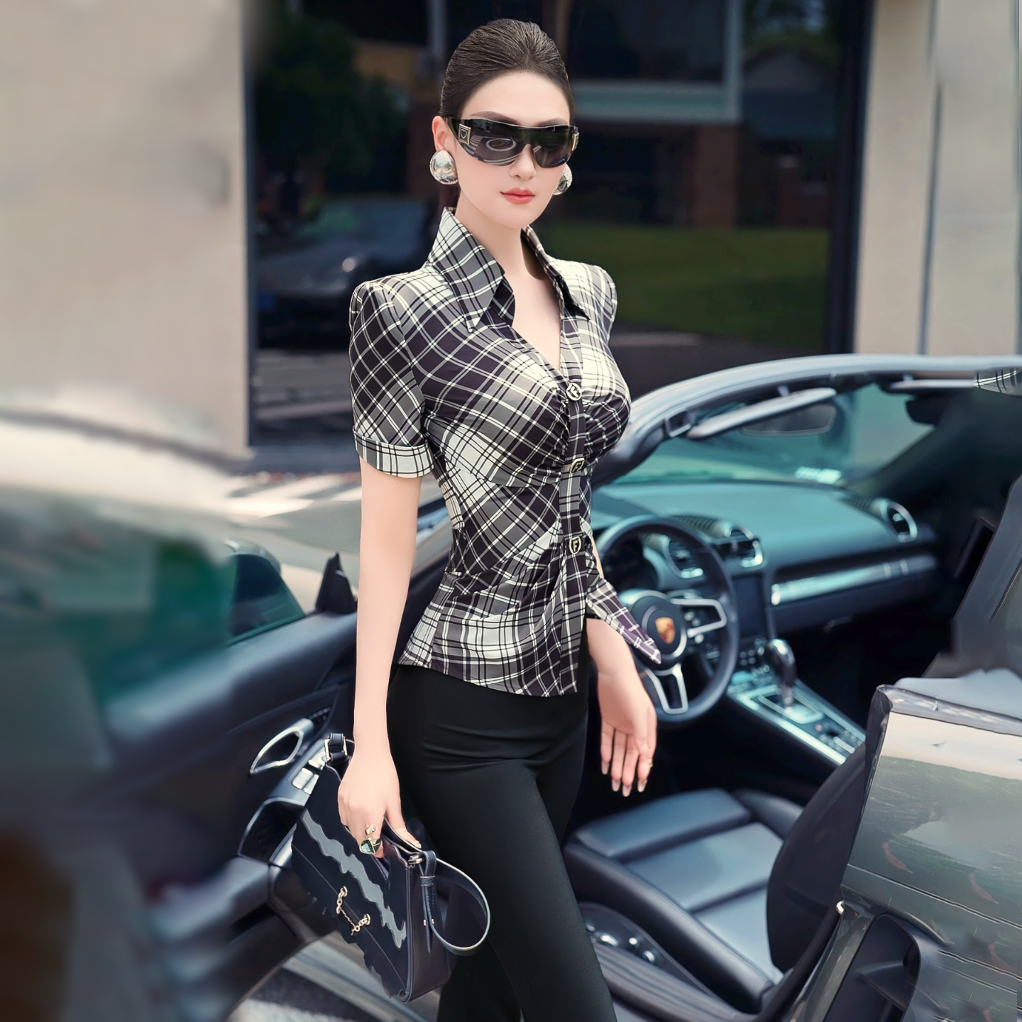 VJE夏季时尚格纹短袖修身收腰衬衫2025新款时尚定位印花上衣