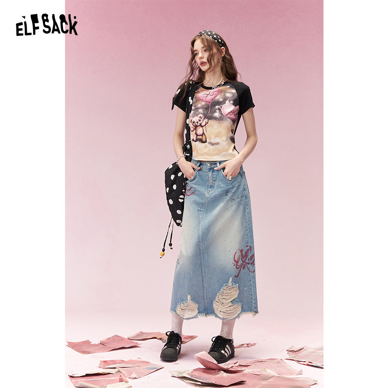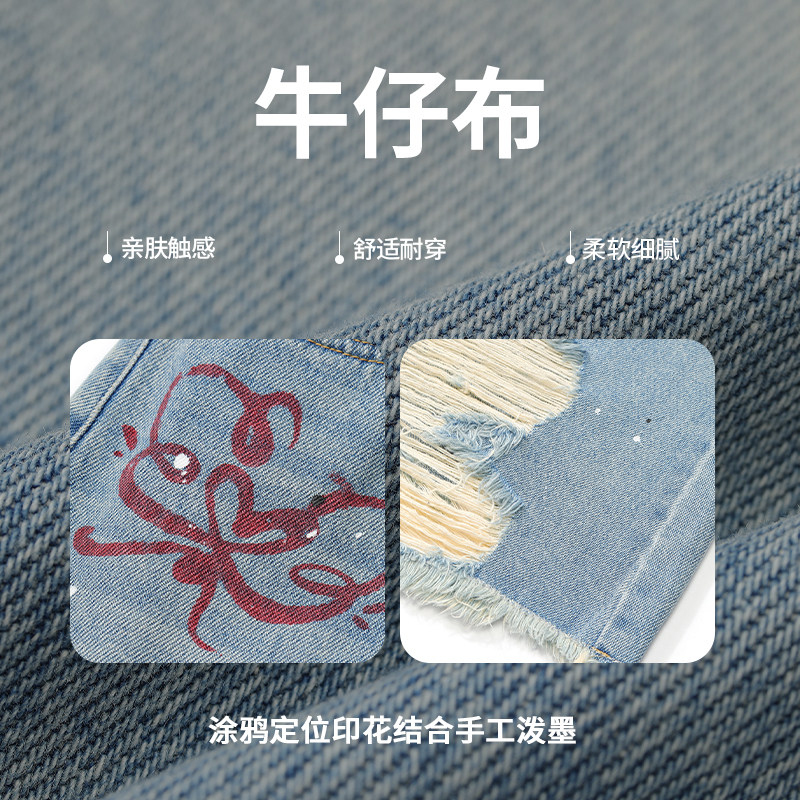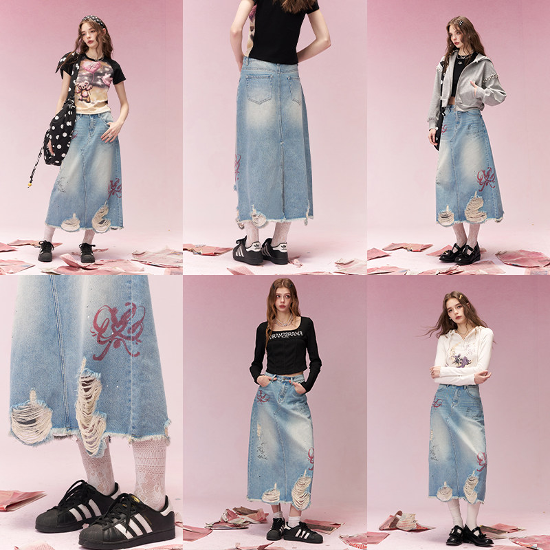 妖精的口袋原创涂鸦印花高腰半身裙女2026春夏新款后开叉牛仔长裙
