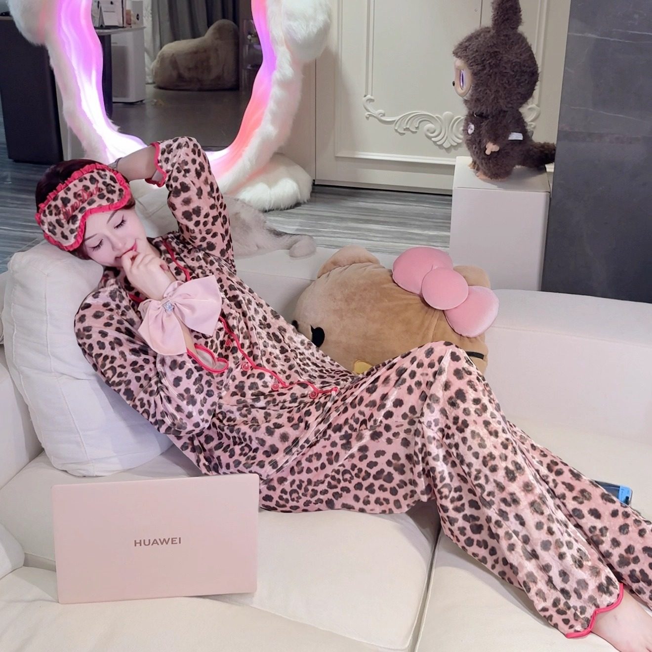 【张雨绮同款】汀黛25秋冬新款睡衣女粉色豹纹显瘦丝绒家居服套装
